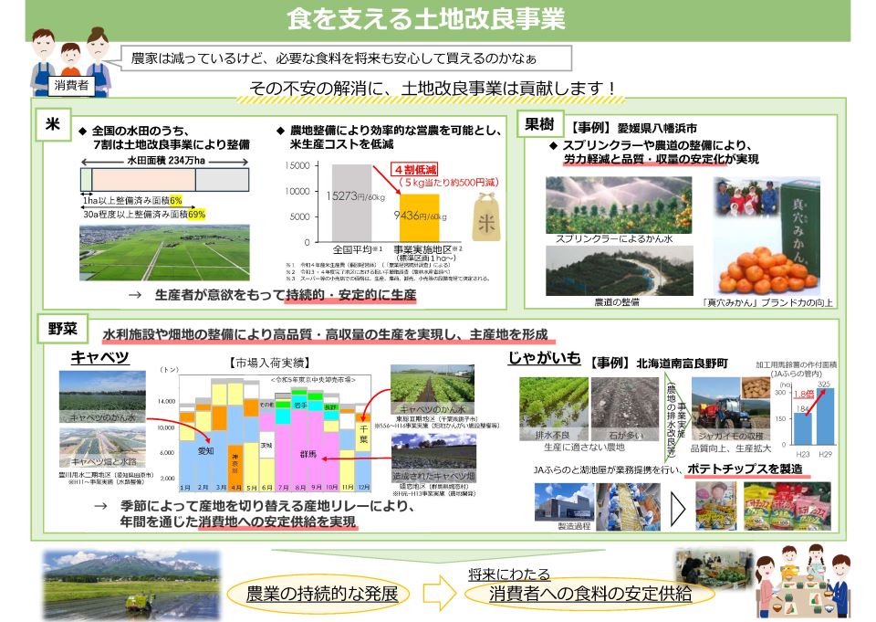 土地改良事業は、農業者だけでなく、消費者を含めた国民全体の食と暮らしを支えています。
