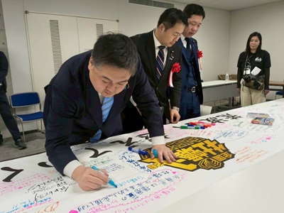 横断幕に激励のメッセージを記入する山本農林水産大臣政務官