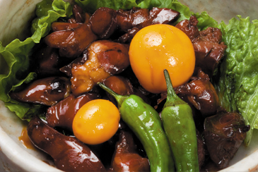 甲府鳥もつ煮 〈山梨県〉 戦後間もないころ、そば屋の職人が考案した郷土料理。砂肝、ハツ、レバー、きんかんを砂糖としょうゆの甘辛く濃厚なたれで、強火で短時間のうちに照り煮に。 写真提供/甲府市 |
