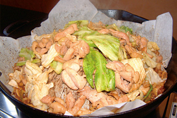 鶏(けい)ちゃん焼き〈岐阜県〉 下呂市の名物メニュー。しょうゆやみそ、にんにくだれを絡めた鶏肉をキャベツなどの野菜と一緒に、鉄板やジンギスカン鍋でシンプルに焼きながら食べる。 写真提供/下呂市 |