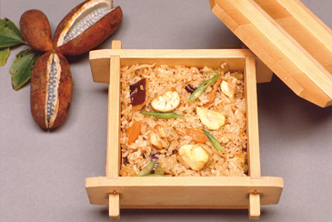 蒜山(ひるぜん)おこわ 〈岡山県〉 真庭市の蒜山地域では、祭りや祝い事に欠かせない料理の一つ。もち米、鶏肉の他に、油揚げ、しいたけ、ふき、栗などを使うのが蒜山おこわ。 写真提供/蒜山観光協会 |