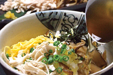 鶏飯(けいはん) 〈鹿児島県〉 鶏肉、しいたけ、錦糸玉子などをのせたごはんに鶏ガラスープをかける。暑い季節でも食べやすい、さっぱり味。奄美大島では古くから慶事や接待で供されていた。 写真提供/奄美市 |