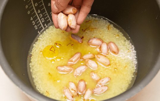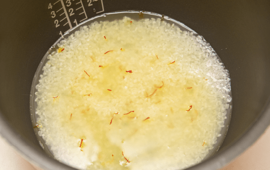 研いだ米、サフランを炊飯器に入れ、釜の1合の線まで水を入れて15分おく。