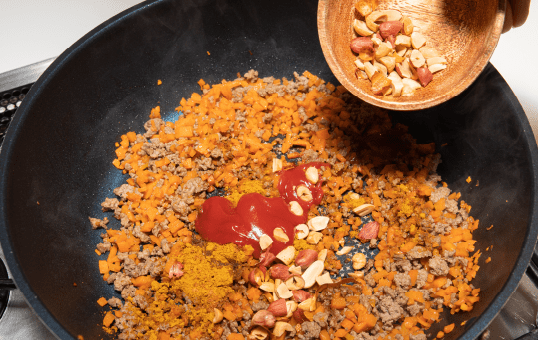 野菜と肉のうま味に落花生の食感をアクセントに加えたドライカレーに合わせるのは、彩りと香りが特徴的なサフランライス。レーズンや刻んだ落花生を散らしたサフランライスは、まるでカレー専門店で出てきそうな見栄えで、食卓が明るくなります。サフランライスに炊き込んだ生の落花生は、お豆のようなポクポクとした仕上がり、ドライカレーに混ぜ込んだ乾燥の落花生はコリコリとした食感で、2種類の落花生の楽しみ方ができます。