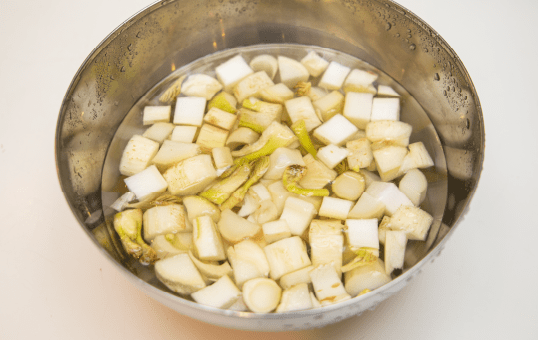 うどは黒くなっているところの皮を剥いて1センチメートル角に切り、水500ミリリットルに大さじ1の酢を入れた酢水に漬ける。