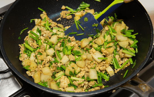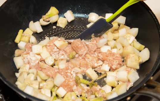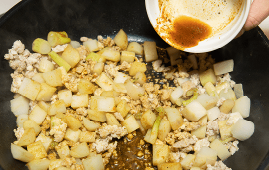 サラダ油をひいたフライパンで、鶏ひき肉と1を炒める。