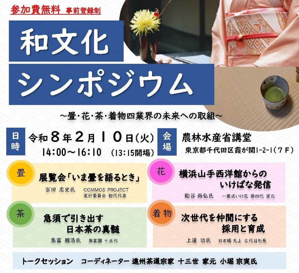 〇 令和8年2月10日(火曜日)、和文化を支える畳・着物・茶・花の各業界による未来への取組を紹介するシンポジウムを開催(事前申込制・参加無料)。