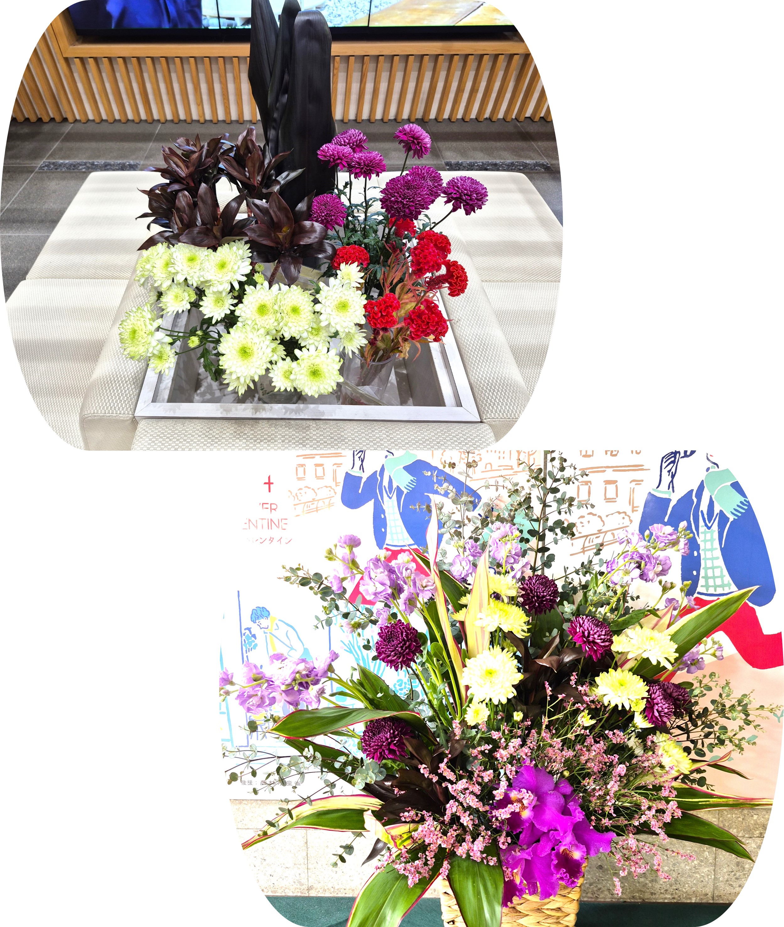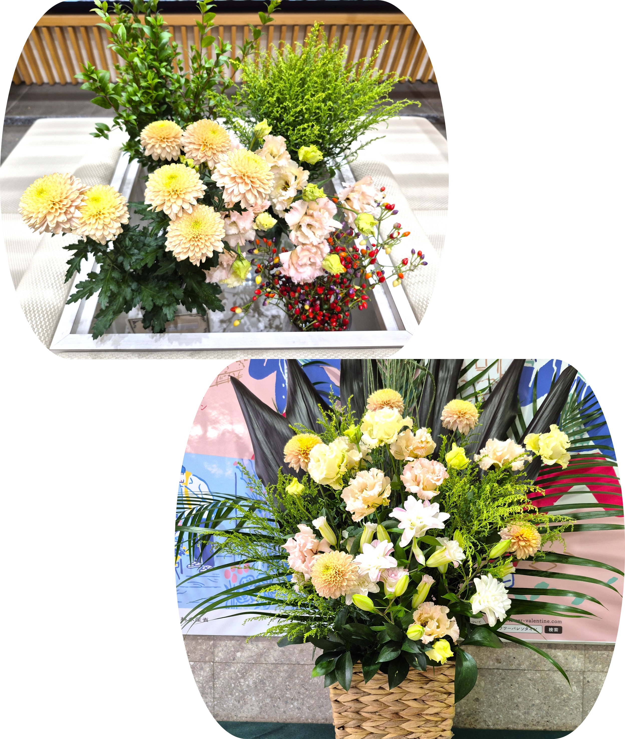 今週は、千葉県産マムなど4種類の切り花とフラワーアレンジメントを展示しています。