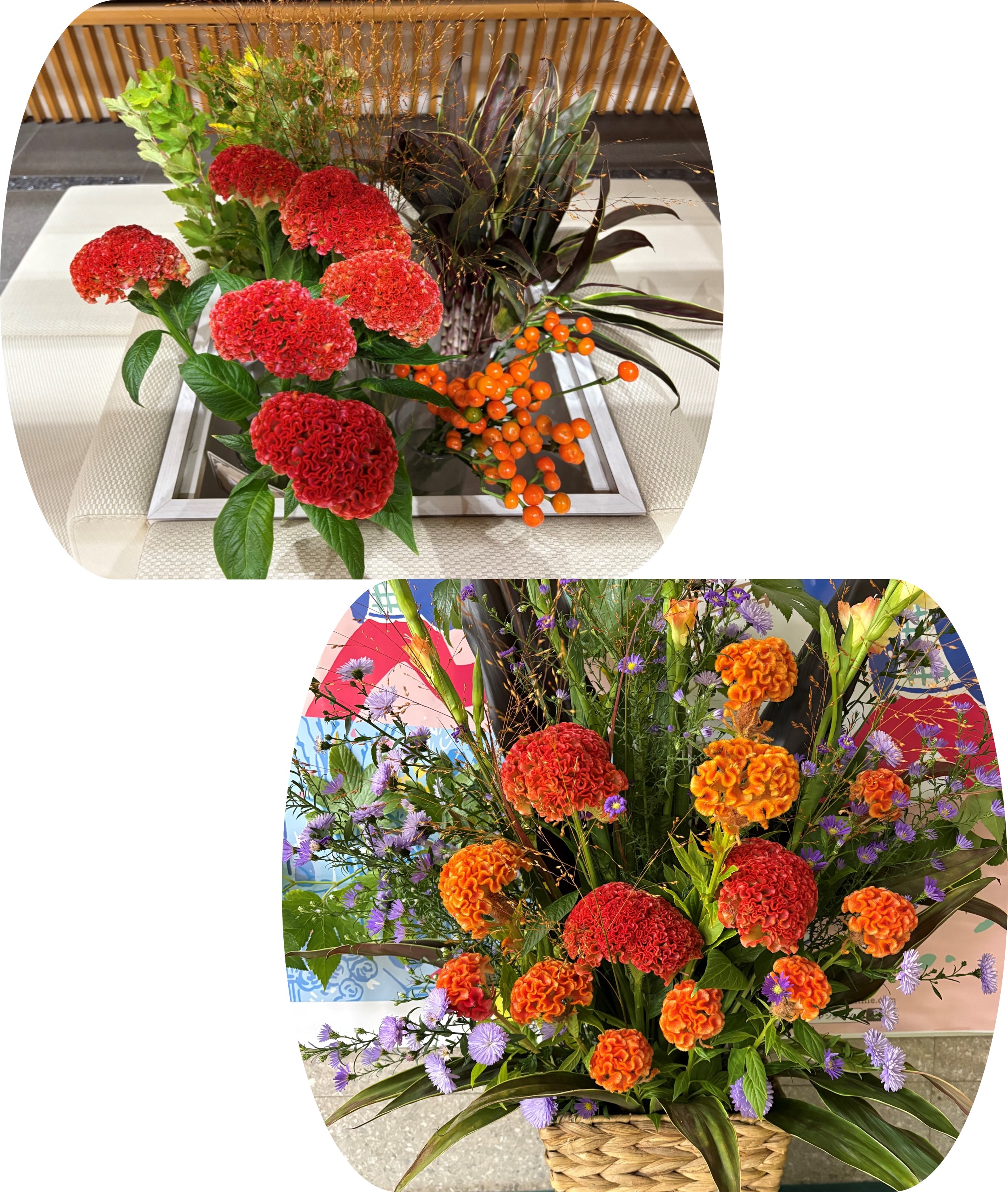 今週は、千葉県産ケイトウなど5種類の切り花とフラワーアレンジメントを展示しています。