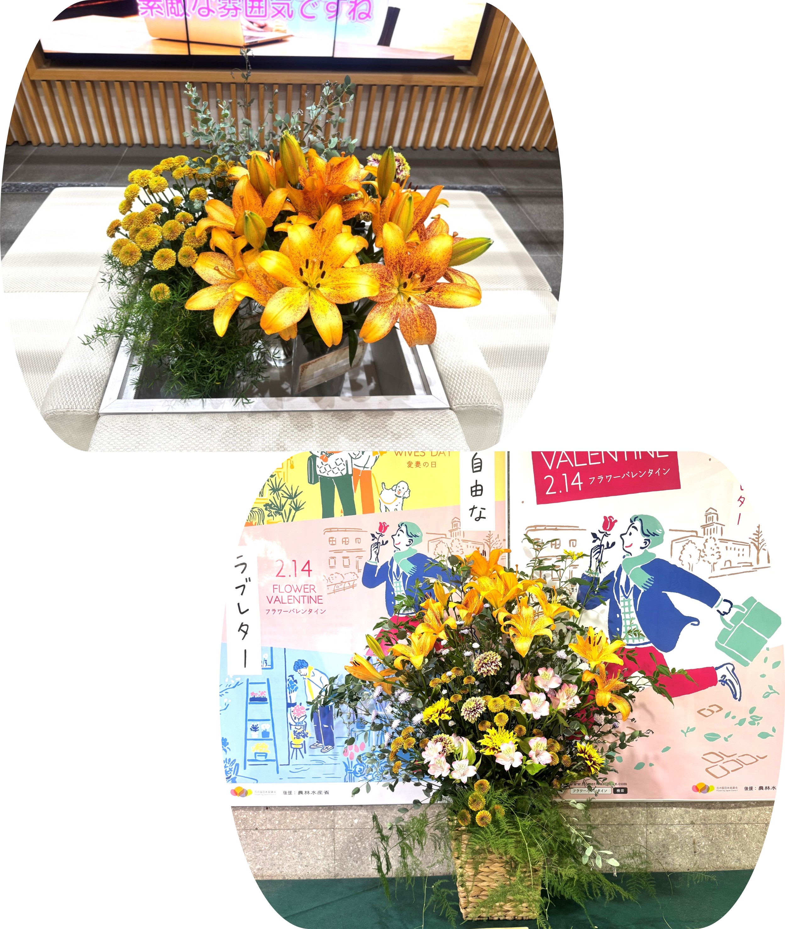 今週は、秋田県産鉄砲ユリなど5種類の切り花とフラワーアレンジメントを展示しています。