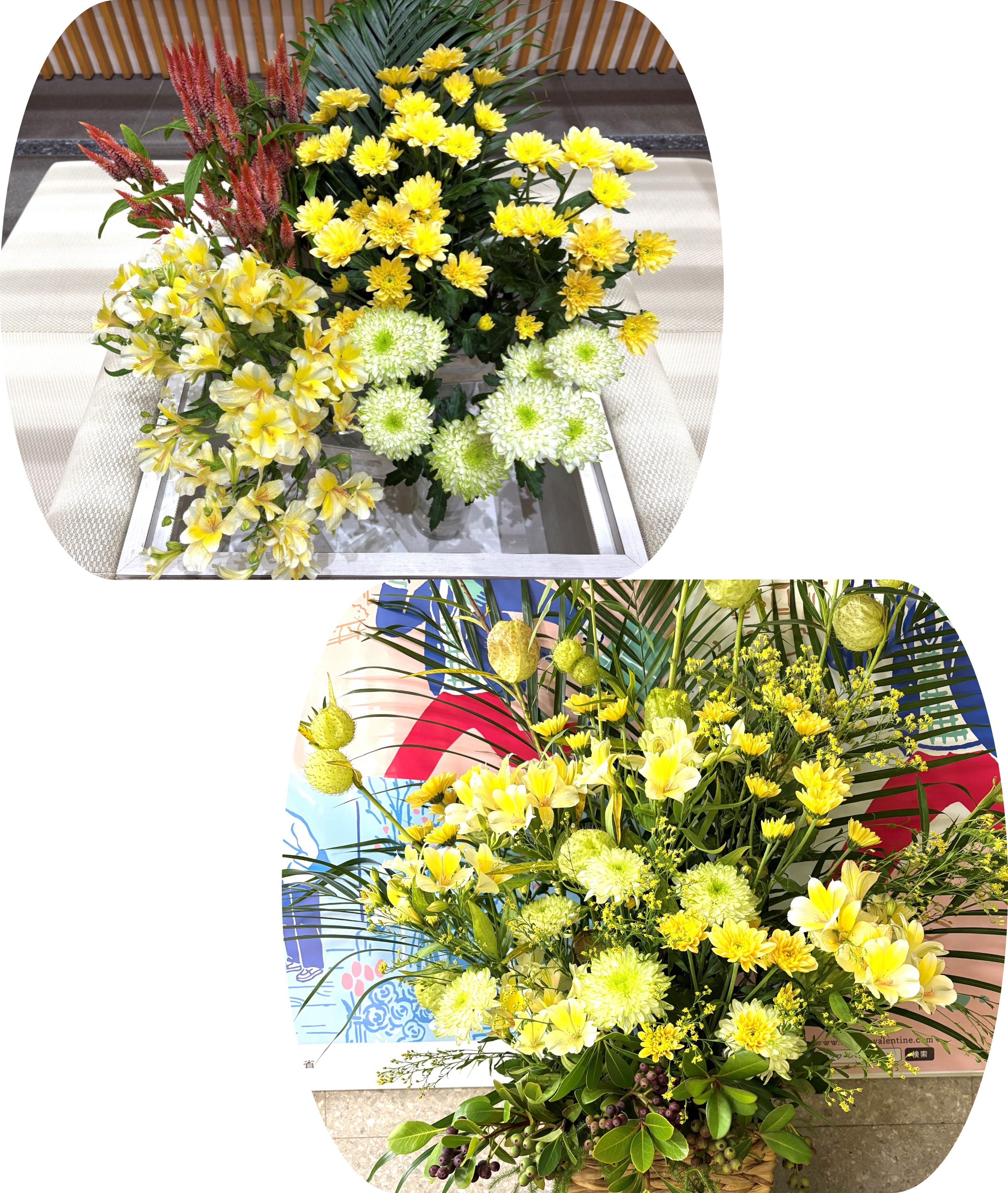今週は、宮城県産マムなど5種類の切り花とフラワーアレンジメントを展示しています。