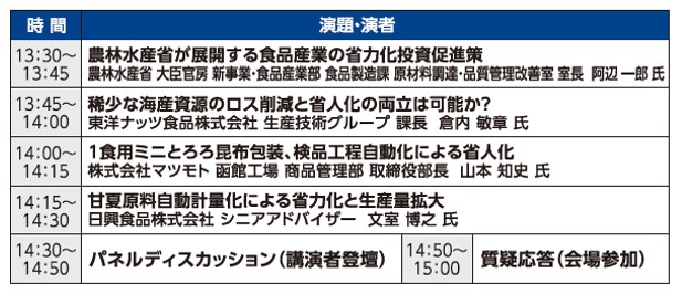 省力化に向けた機械設備導入・投資に係るノウハウを食品企業の皆さまへ提供するため、当省の施策を紹介するとともに、実際に当省の補助金を活用し機械設備を導入した事業者にご講演頂くセミナーを企画しています。