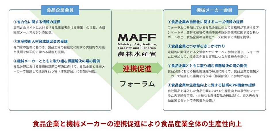 農林水産省は、食品製造業の生産性向上を目指し「食品企業生産性向上フォーラム」を創設しました。食品産業に係る国の施策情報などの情報を食品企業や機械メーカーの皆様にご提供いたします。フォーラムでは、食品製造業の自動化設備/施設の導入、機械化、DX、食品製造現場における生産技術人材育成の支援します。どなたでも無料で参加可能ですので、ぜひフォーラムを活用して生産性向上にお役立てください。
