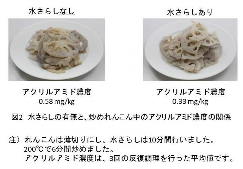 - 水さらしをしたれんこんを炒めるとアクリルアミド濃度が、水さらしをしなかったれんこんを使った場合の半分程度になりました。