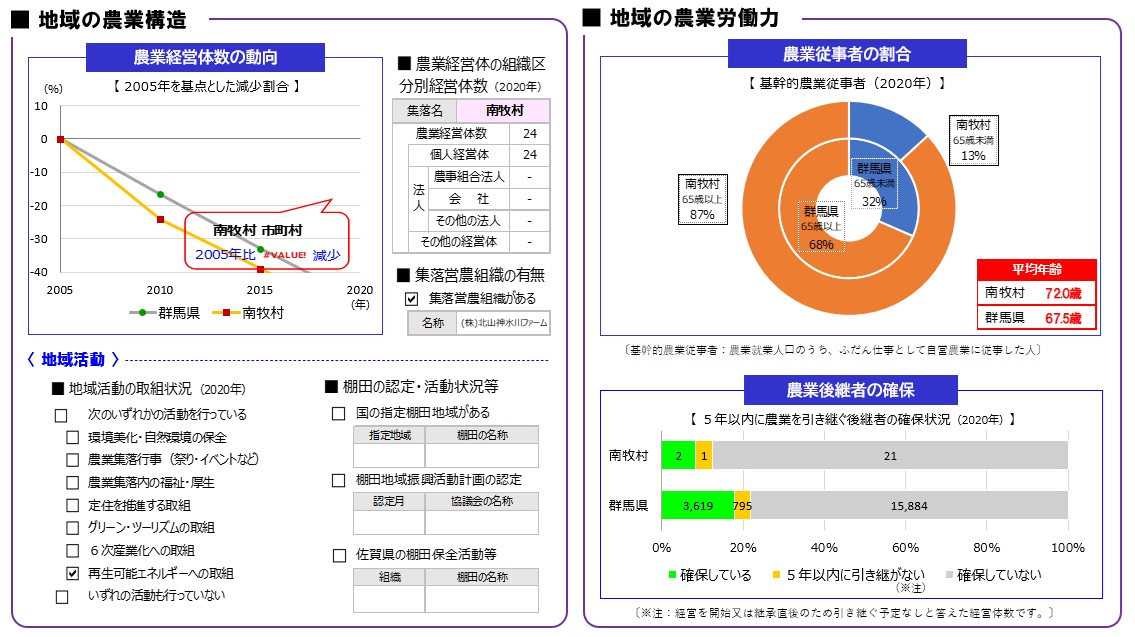 各農家(経営体)の農産物販売金額1位部門を調査し、集落ごとに最も多い部門を色別に表示しています。