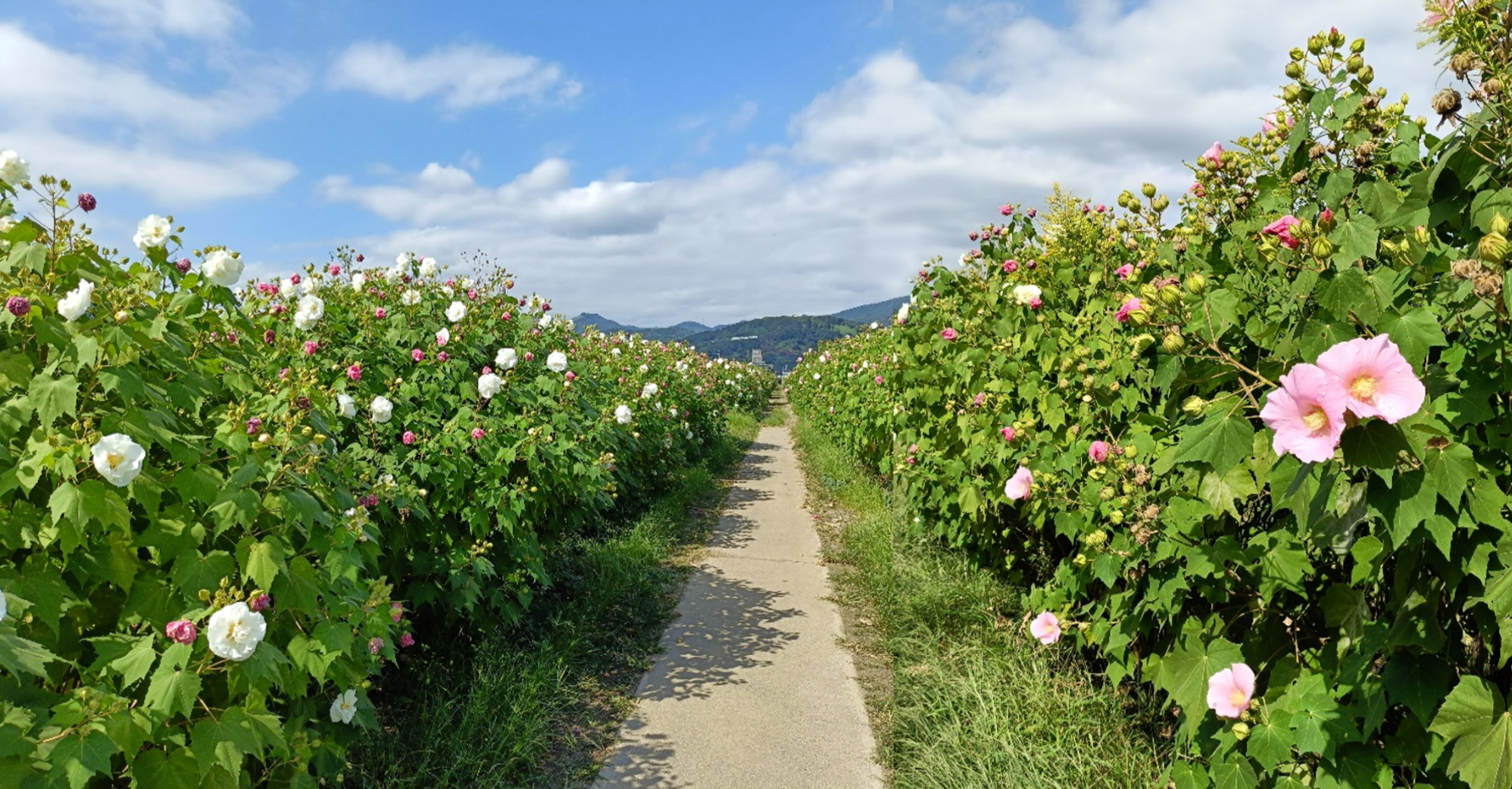 南足柄市千津島のふくざわ公園脇の酔芙蓉(すいふよう)農道では、酔芙蓉と芙蓉の大輪が咲き誇っています。