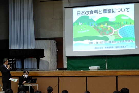 神奈川県立かながわ農業アカデミー(海老名市)の技術専修科生(25名)を対象として、神奈川県の農業の現状、食料・農業・農村基本法改正のポイント及び新たな食料・農業・農村基本計画のポイントについての出前授業を実施しました。