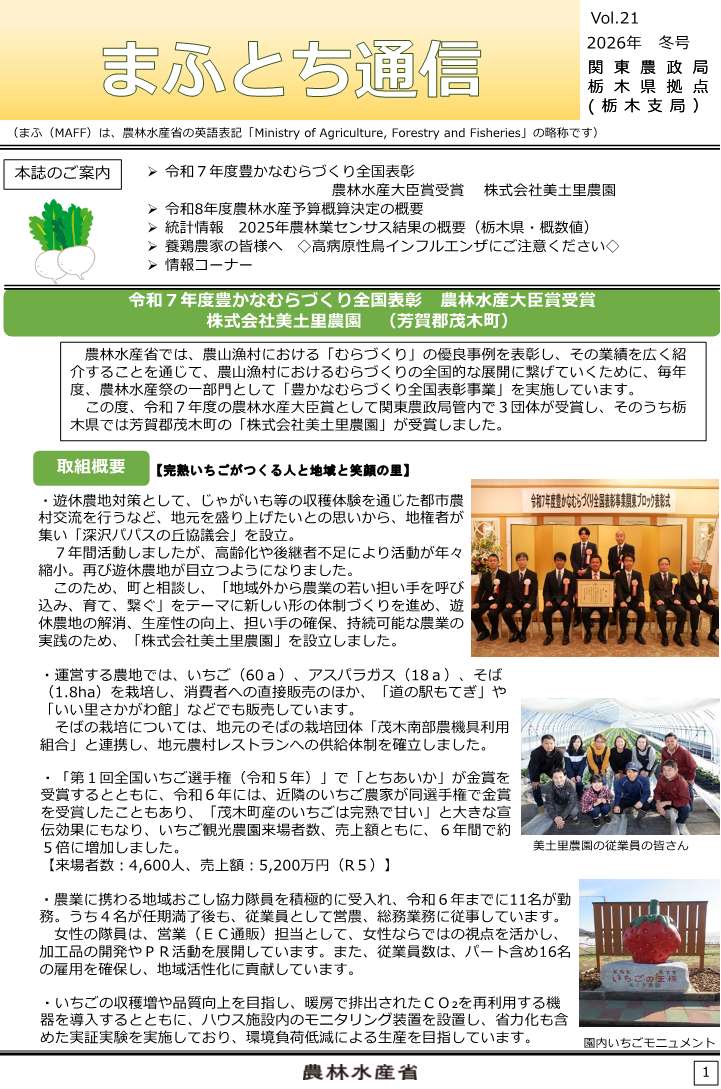 関東農政局栃木県拠点では、「現場と農政を結ぶ」業務を通じて、地域の農林水産業関係者の皆様にタイムリーに農政に関する情報をお伝えするとともに、農業現場の抱える課題やニーズ、農政に対する御意見や御要望をきめ細かく汲み上げ、各種施策に繋げていくこととしています。本誌は、生産者や関係機関の皆様にとりまして有益な情報の掲載に努めて参りたいと考えておりますので、ご意見やご要望をお寄せ頂ければ幸いです。