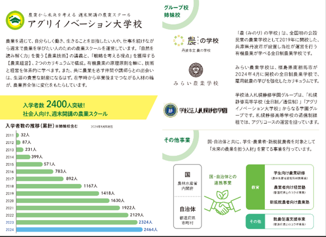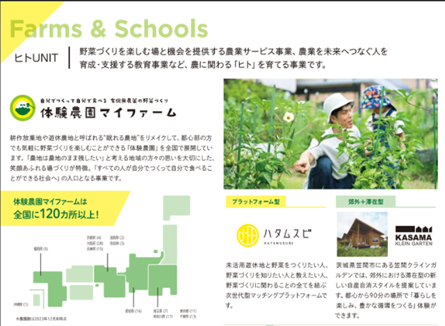 東京都、千葉県、京都府、大阪府、福岡県など12都府県120か所以上で、耕作放棄地や遊休農地だった農地を活用して、体験農園を運営。また、有機農業の原理原則を軸に、技術と経営を体系的に学べる農業スクールも運営。官民連携の農業学校も開校・運営。