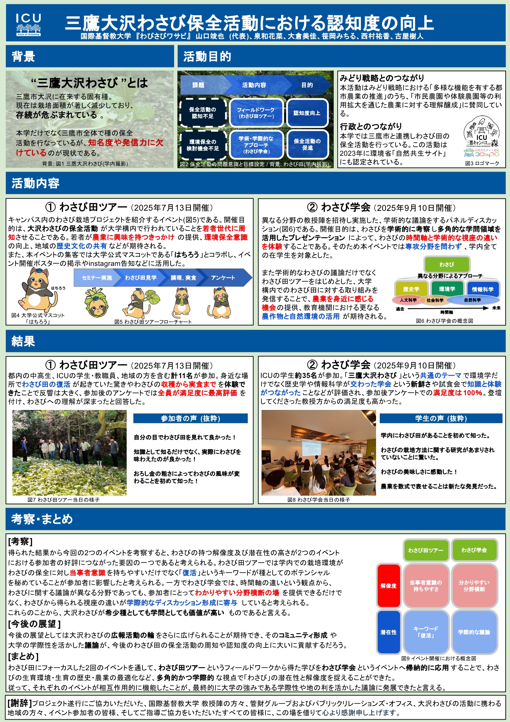 ICUの魅力あるわさび田を多くの人に知ってもらいたい"という思いで取り組みました。わさび田ツアーや教授陣による「わさび学会」などを通して、大沢わさびの魅力と環境保全の大切さを発信できたと感じます!