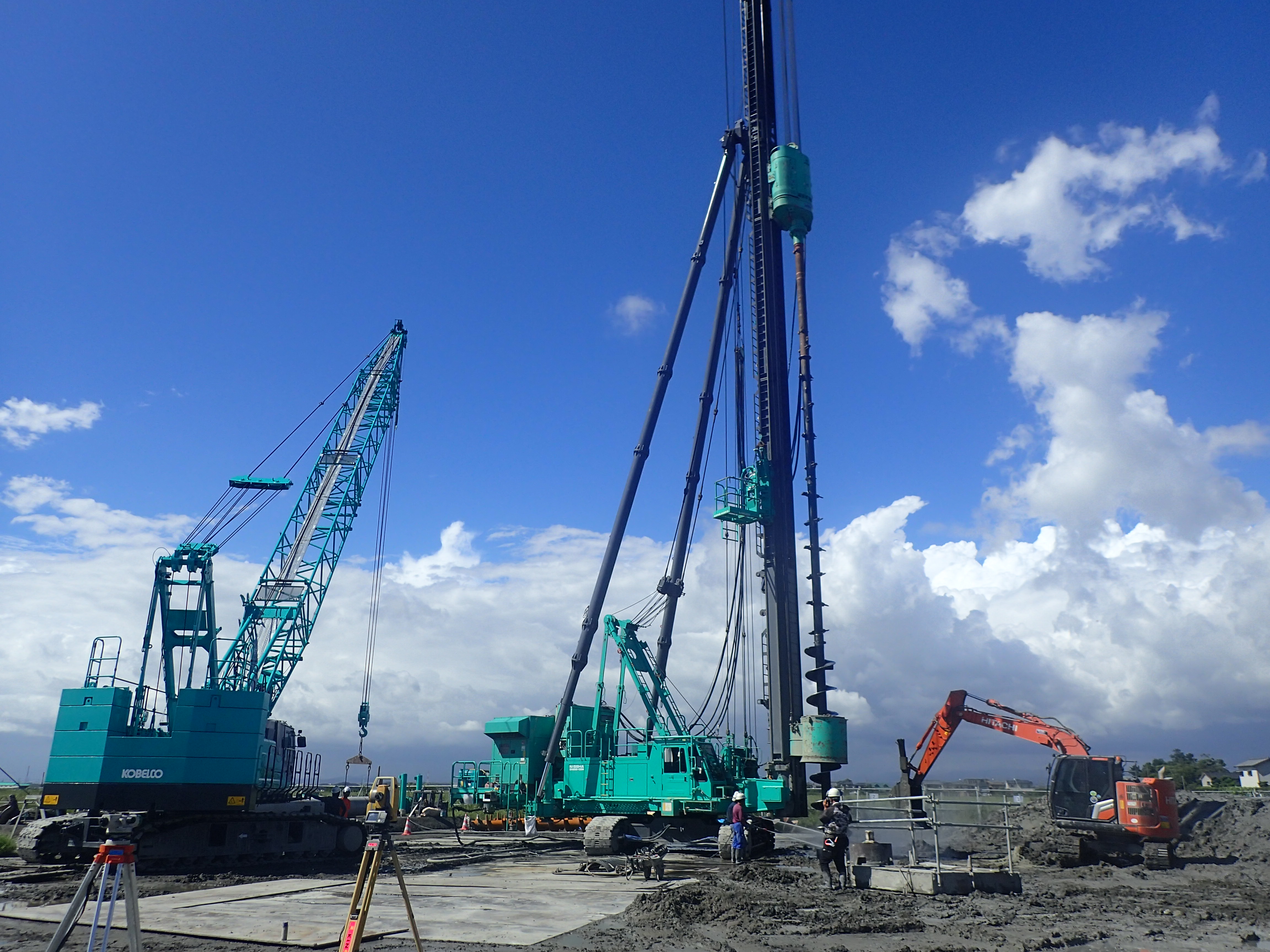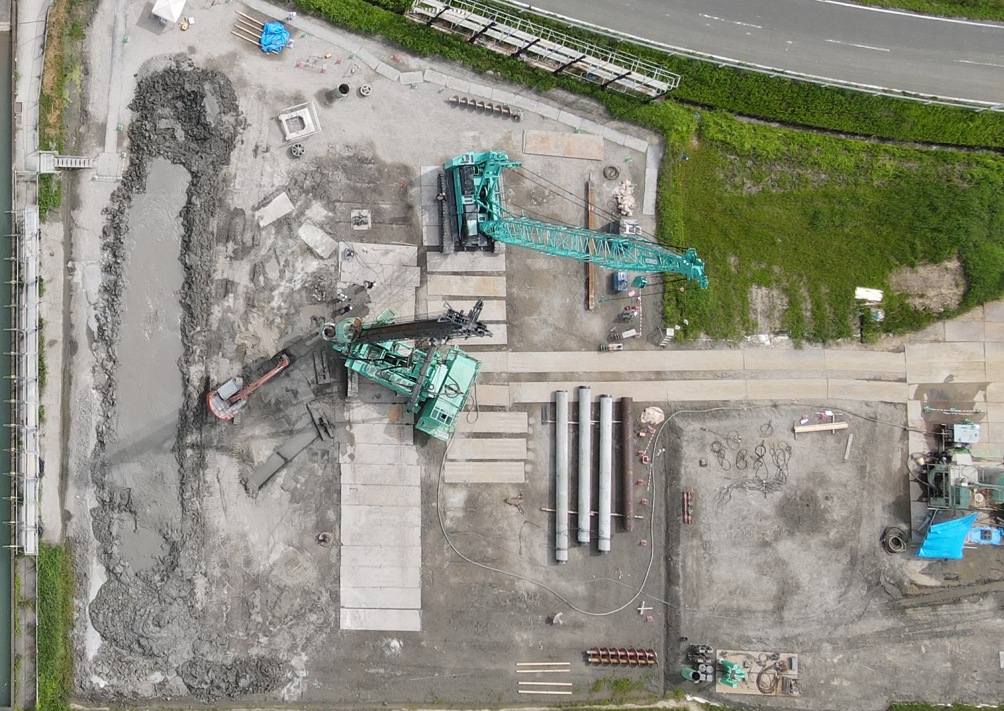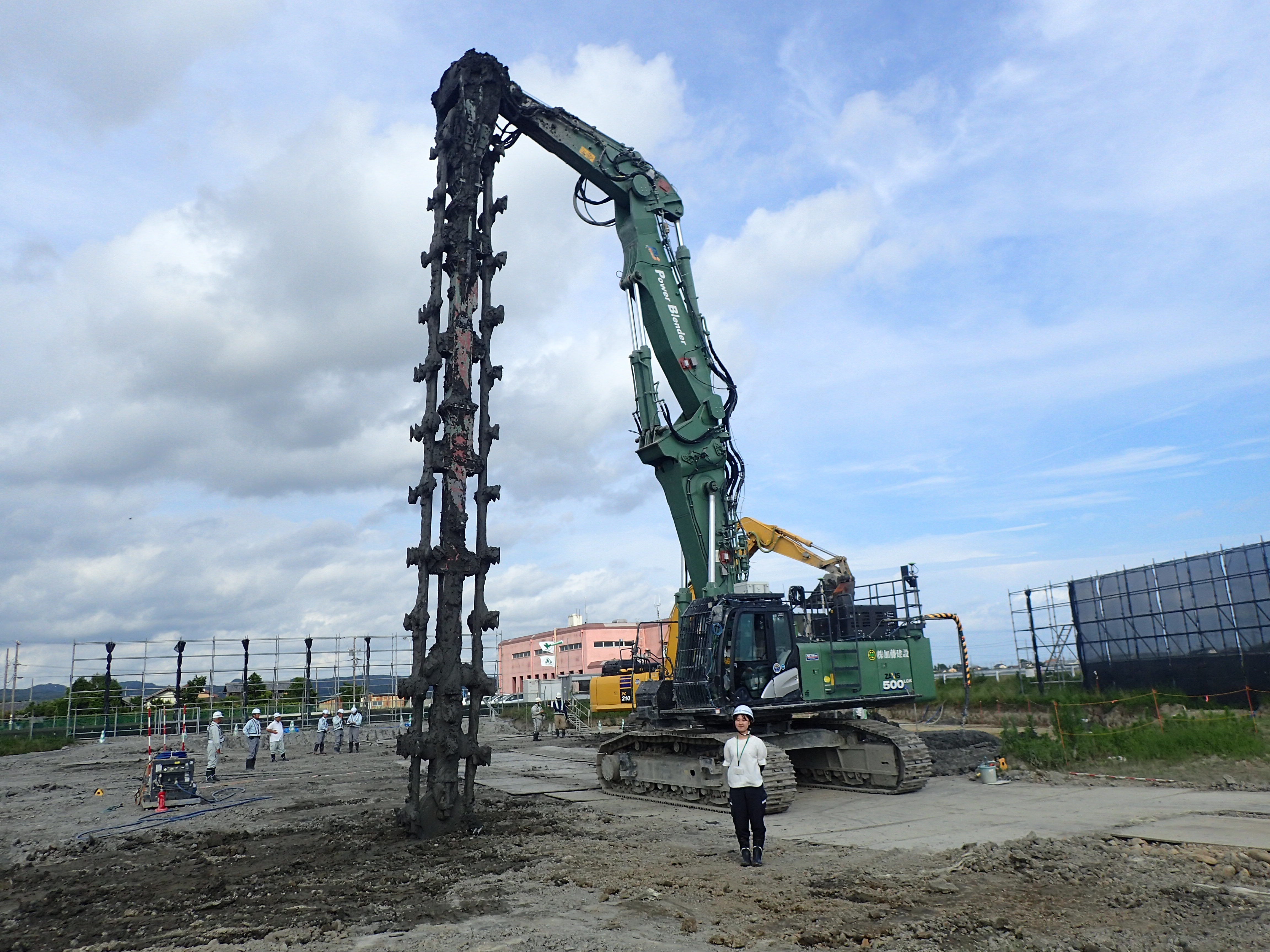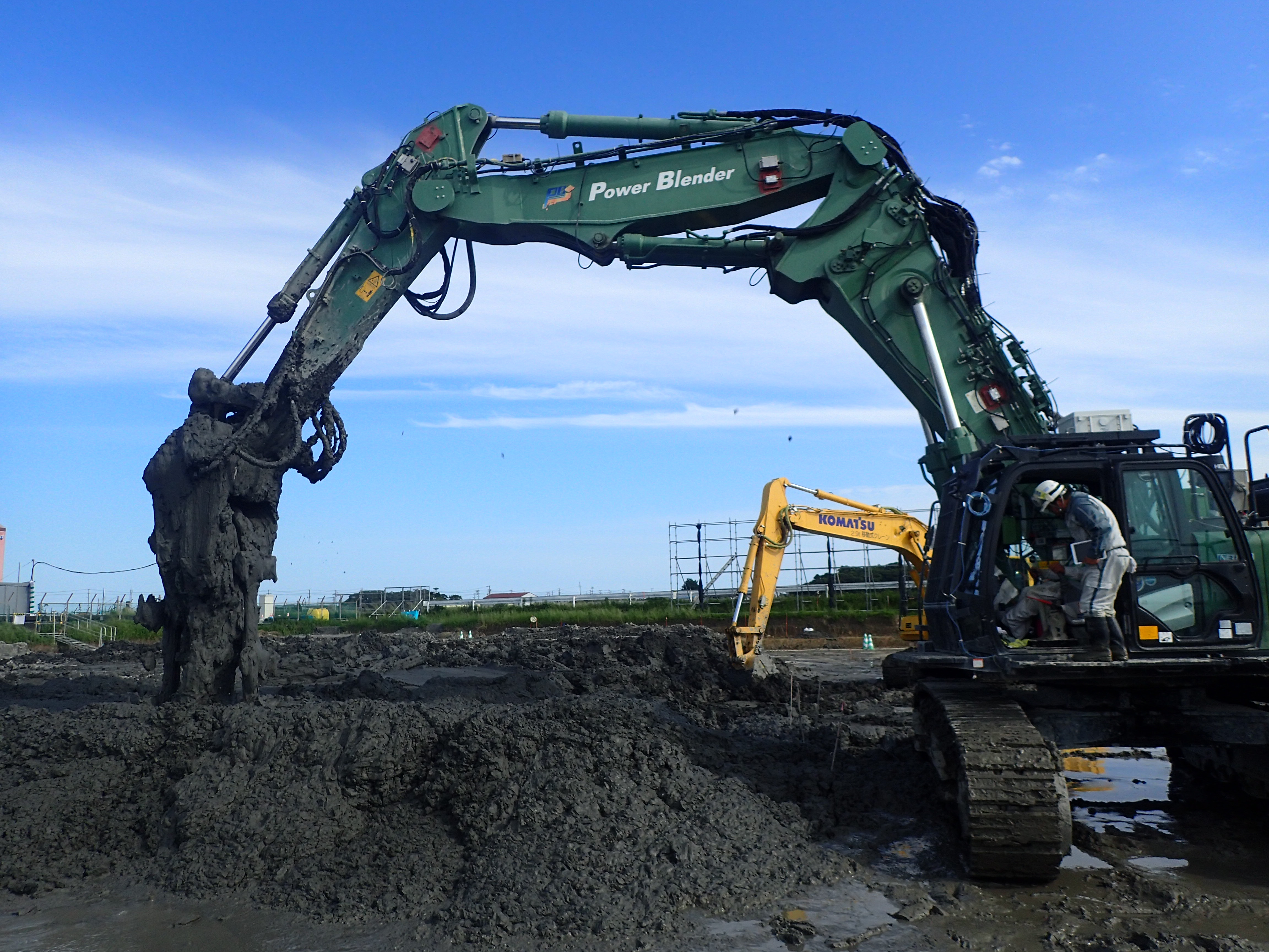 | 【トレンチャ式撹拌混合機】 | 【令和5年7月末】 (地盤改良土留工) |