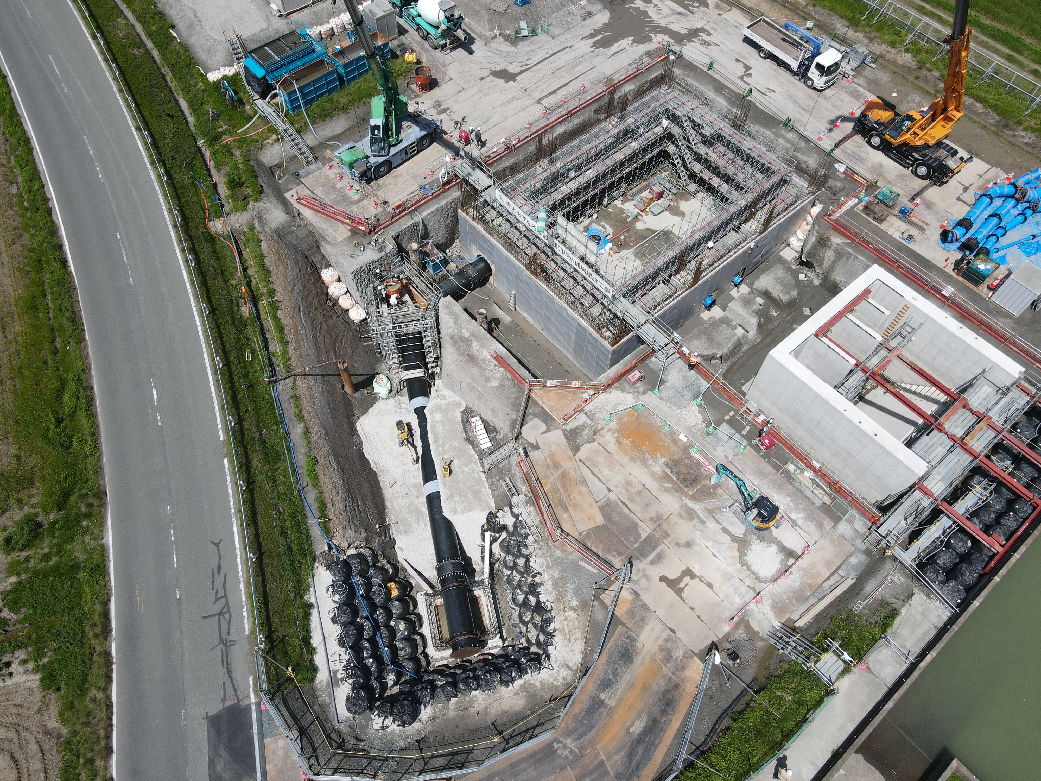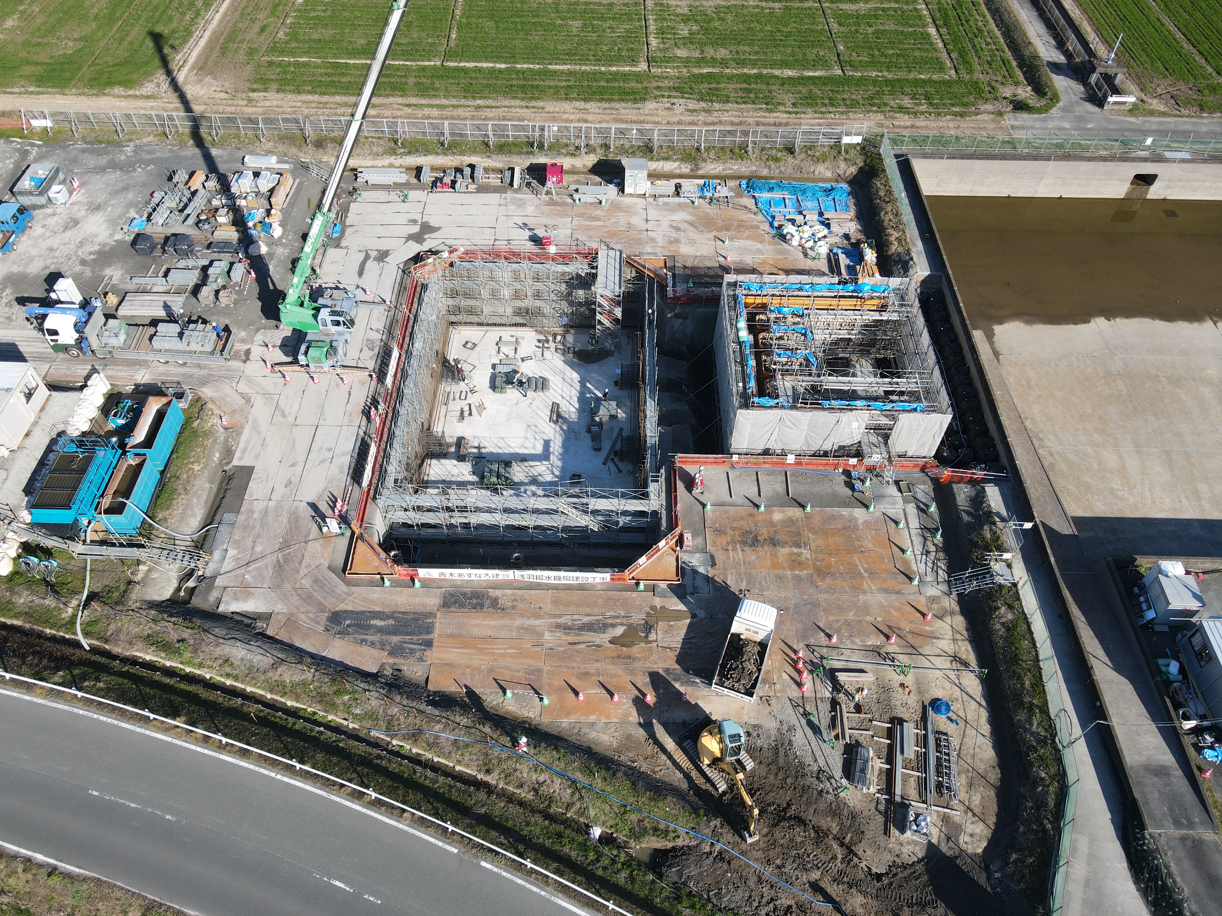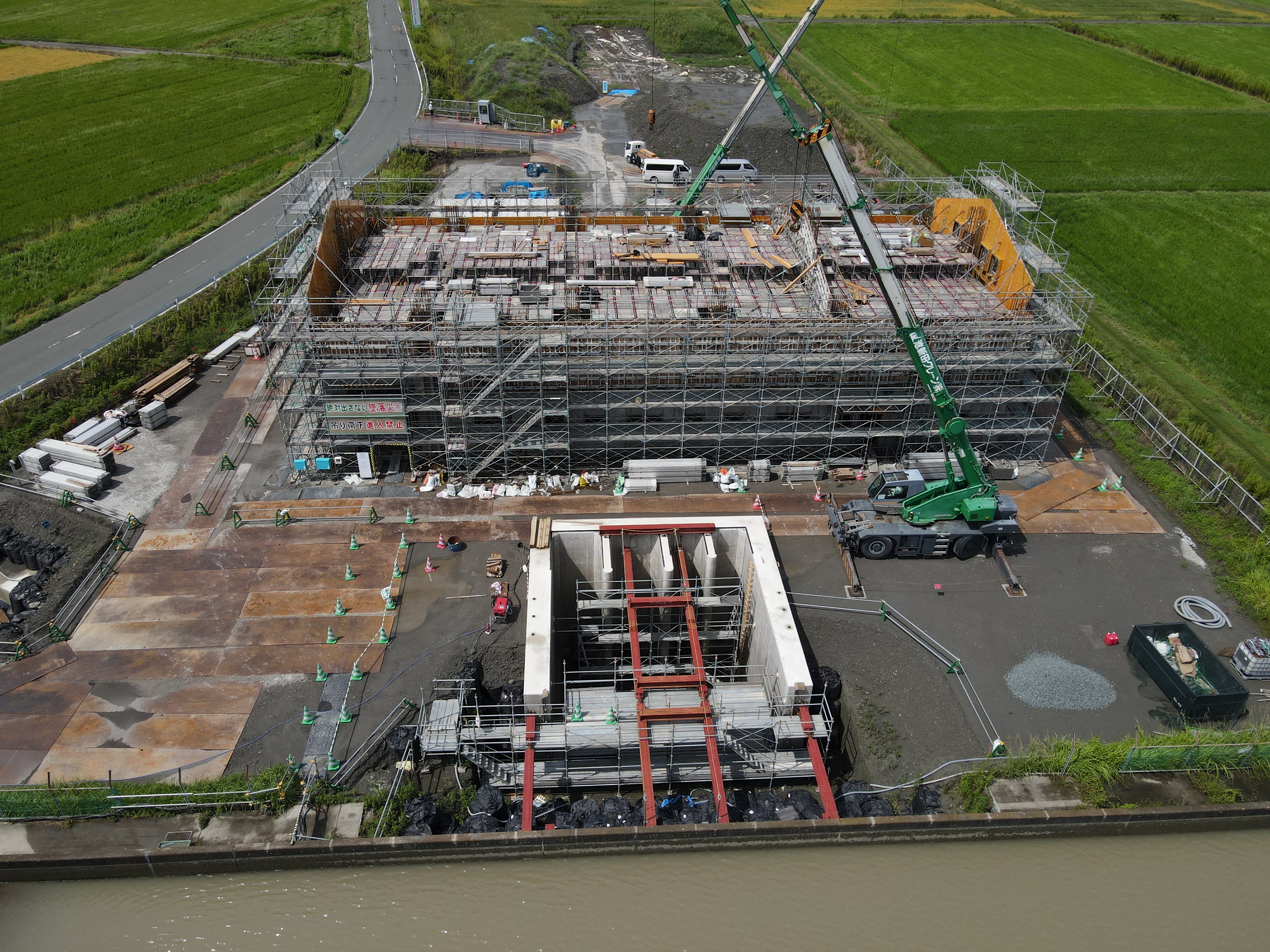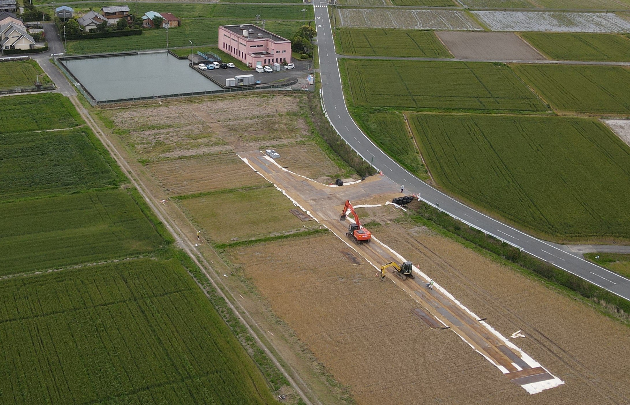 | 【トレンチャ式撹拌混合機】 | 【令和5年7月末】 (地盤改良土留工) |
