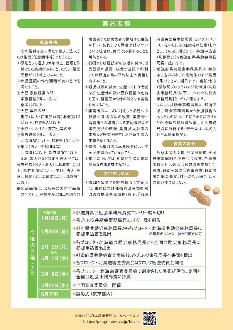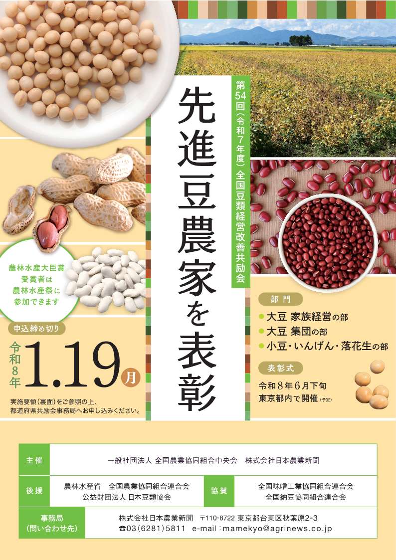 全国豆類経営改善共励会は、(一社)全国農業協同組合中央会、株式会社JA新聞連の主催により、昭和47年度から毎年開催され、特に豆作の経営改善の面から先進的で他の範となる経営体および生産集団を表彰するとともに、その成果を広く紹介するものです。((公財)日本豆類協会、農林水産省が後援し、豆類関係団体も協賛)