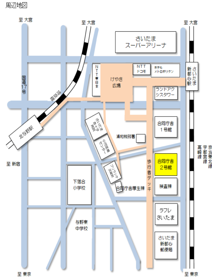 ▼周辺の駅から合同庁舎2号館までの案内図JR京浜東北線・高崎線・宇都宮線「さいたま新都心駅」下車徒歩7分、JR埼京線「北与野駅」下車徒歩10分