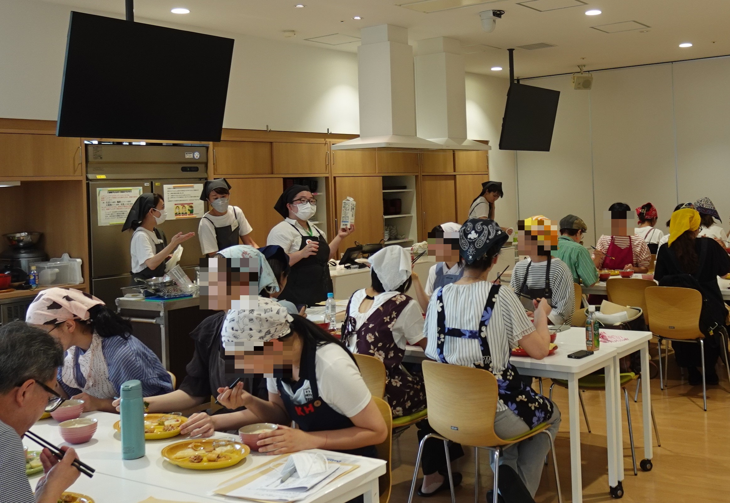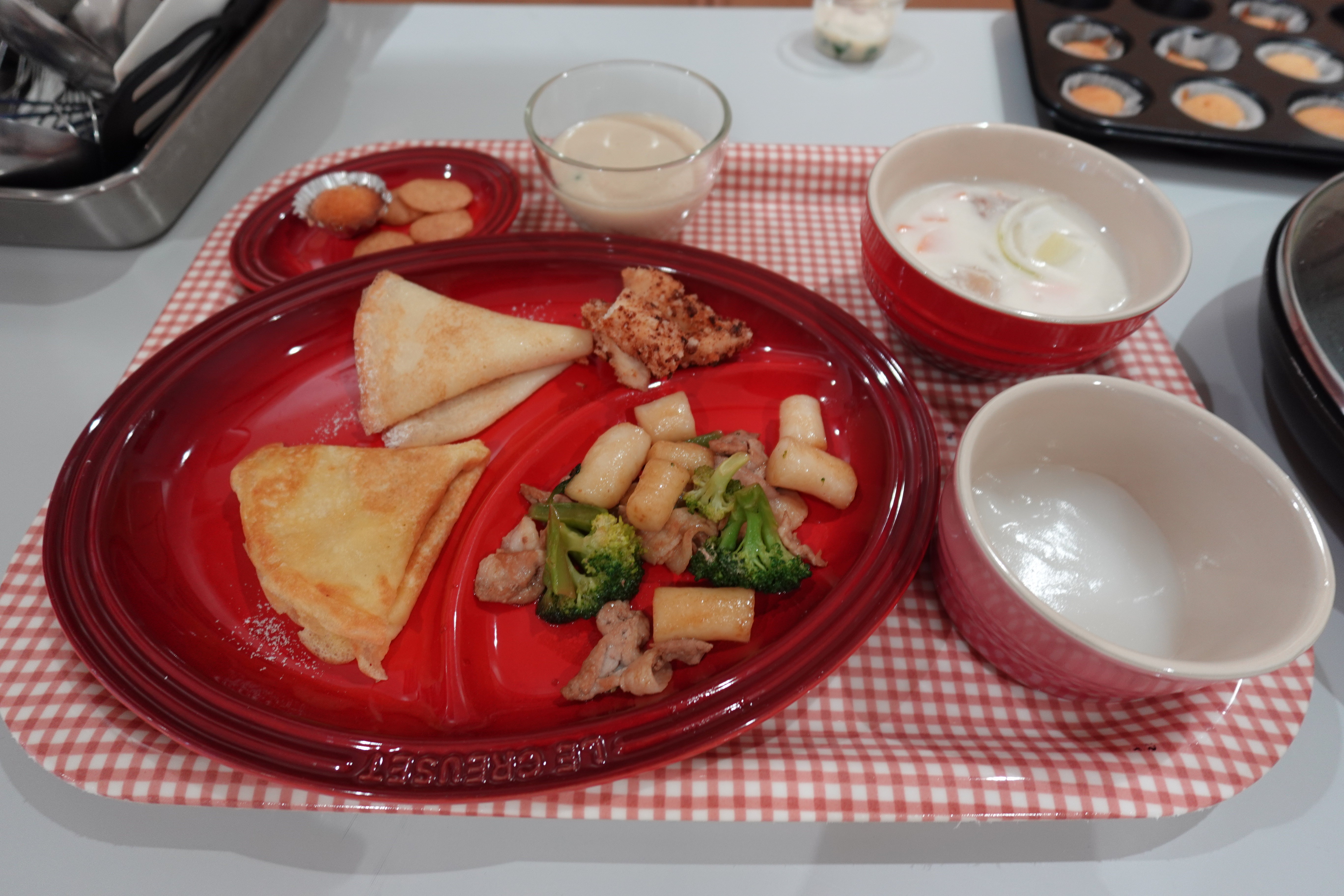 料理教室では、近畿米粉食品普及推進協議会副会長で一般社団法人キッズキッチン協会副会長の坂本佳奈氏より「米粉マエストロになろう!」をテーマに米粉料理のレシピが紹介されました。参加者は、「米粉を小麦粉の代替として使用したクリームシチュー」、「トック(韓国風の餅)と鶏肉とキャベツの炒め物」、「米粉のクレープ」作りに挑戦し、「トックがもっちりとしていて美味しかった、簡単にできるのがびっくりした」、「米粉クレープは小麦粉とは違うおいしさがあって良かった」等の多くの感想が寄せられました。