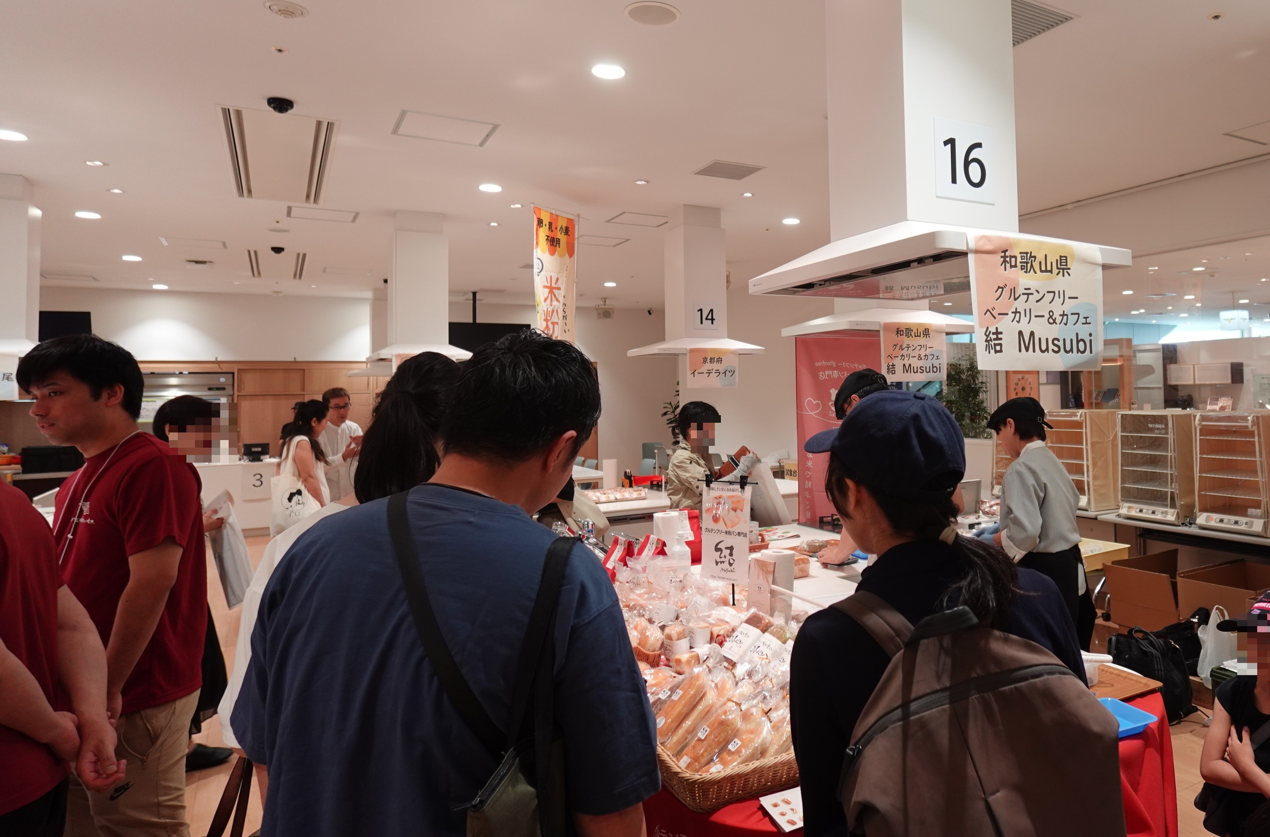 近畿2府4県の米粉商品取扱店舗13店が集合したフードブースでは、試食と物販を行いました。参加者からは「小麦アレルギーの娘が試食を喜んで食べることができ、嬉しかった」、「普段行けない遠くにあるお店も知ることができて良かった」、「今後もぜひ開催してほしい」等の多くの感想が寄せられました。