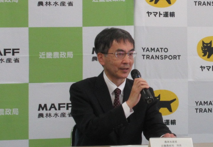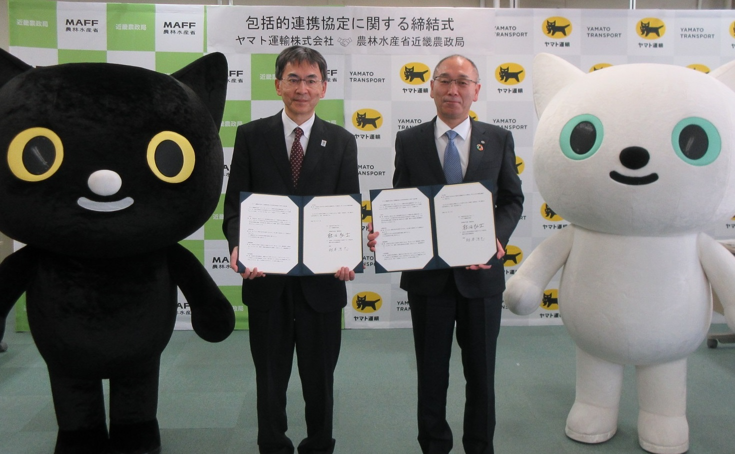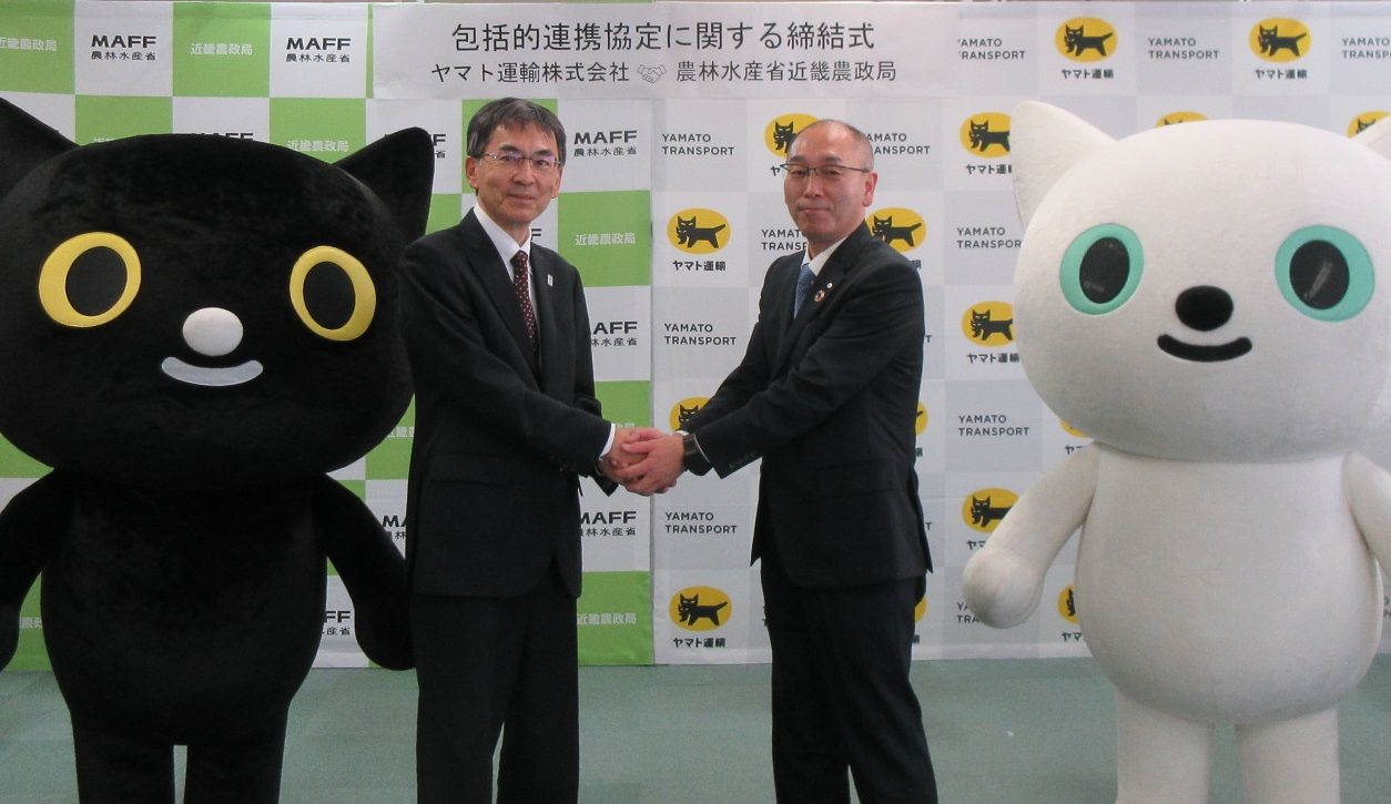 ヤマト運輸株式会社関西統括と近畿農政局は、近畿管内における食品の効率的な運送等について連携することに合意し、令和7年1月20日(月曜日)に包括的連携協力に関する協定の締結式を開催いたしました。締結式では双方の代表者であるヤマト運輸株式会社常務執行役員関西統括松田弘士氏と近畿農政局相本浩志局長が協定証に署名し、握手を交わしました。