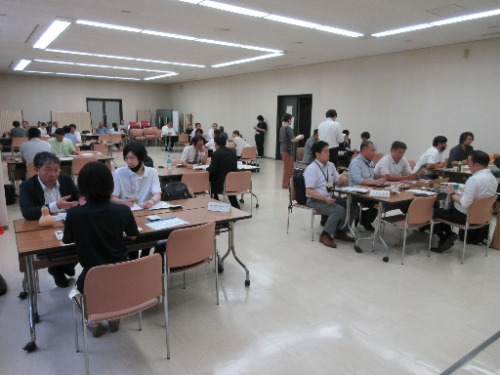 商談会では、近畿農政局から「みどり法に基づく認定制度」「みえるらべる」等について、兵庫県立農業大学校から「有機農業アカデミーの学生募集」について情報提供を行った後、生産者と実需者による延べ125回の商談が行われました。