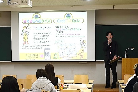 近畿農政局のみどりの食料システムを推進するために結成された、「ええやんみどり!」チームの4人の若手職員が、「みえるらべるクイズ1)」を紹介しました。受講生は各自のスマートフォンを使って、周囲の受講生や若手職員とも相談しながら回答し、楽しみながら学習しました。