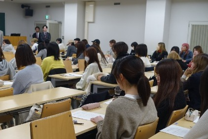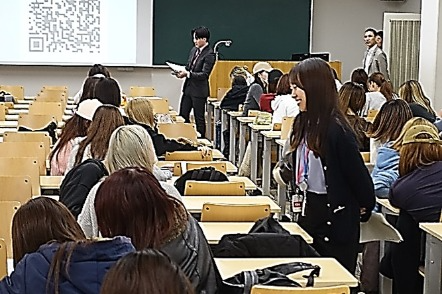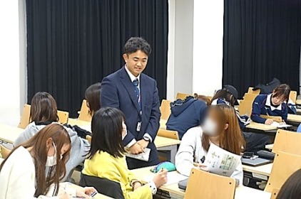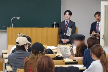 令和7年11月18日(火曜日)、甲南女子大学(兵庫県神戸市)において、近畿農政局生産部 土江持続的食料システム戦略推進官が講師を、若手職員がアシスタントを務め、人間科学部生活環境学科1年生90名を対象に「わたしたちの食の未来と「みどりの食料システム戦略」」をテーマに出張講座を実施しました。