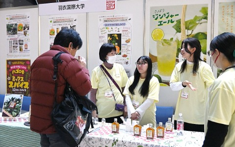 摘果みかんジンジャーシロップの試飲を勧める羽衣国際大学の学生