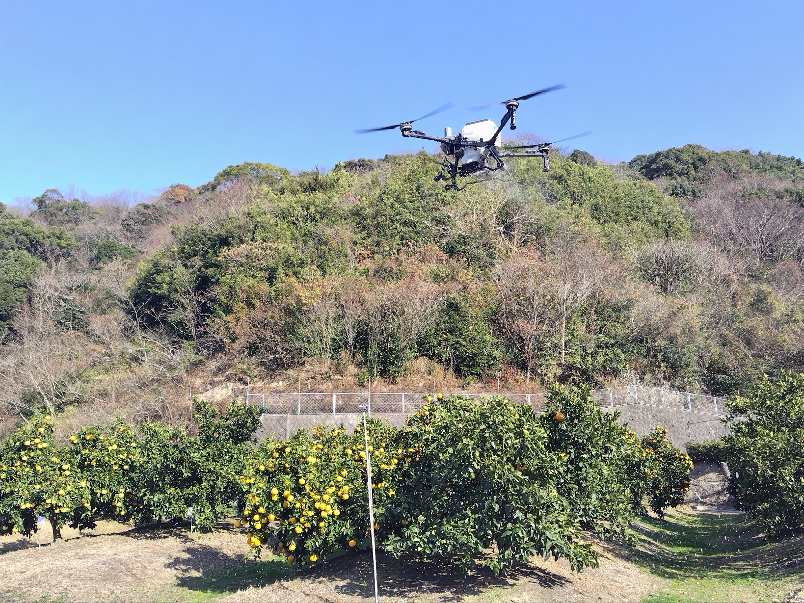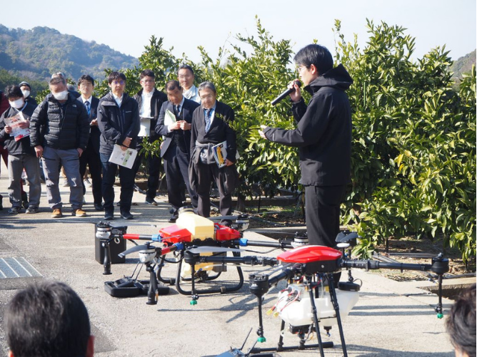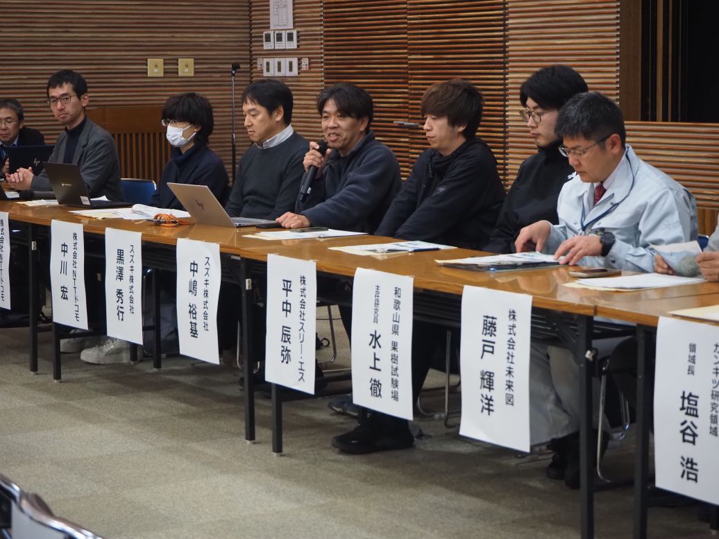 令和8年1月16日(金曜日)和歌山県果樹試験場(和歌山県有田郡有田川町)において、近畿農政局、和歌山県の共同開催により、中山間地域における果樹等のスマート農業技術に関する研修会及び展示・実演会を開催しました。午前は、管内各府県の普及指導員、スマート農業及び中山間地域直接支払制度担当者を対象とした研修会として、約70名が参加しました。午後はスマート農業機械開発企業9社による展示・実演会として、一般の方も加わり、約150名の参加がありました。