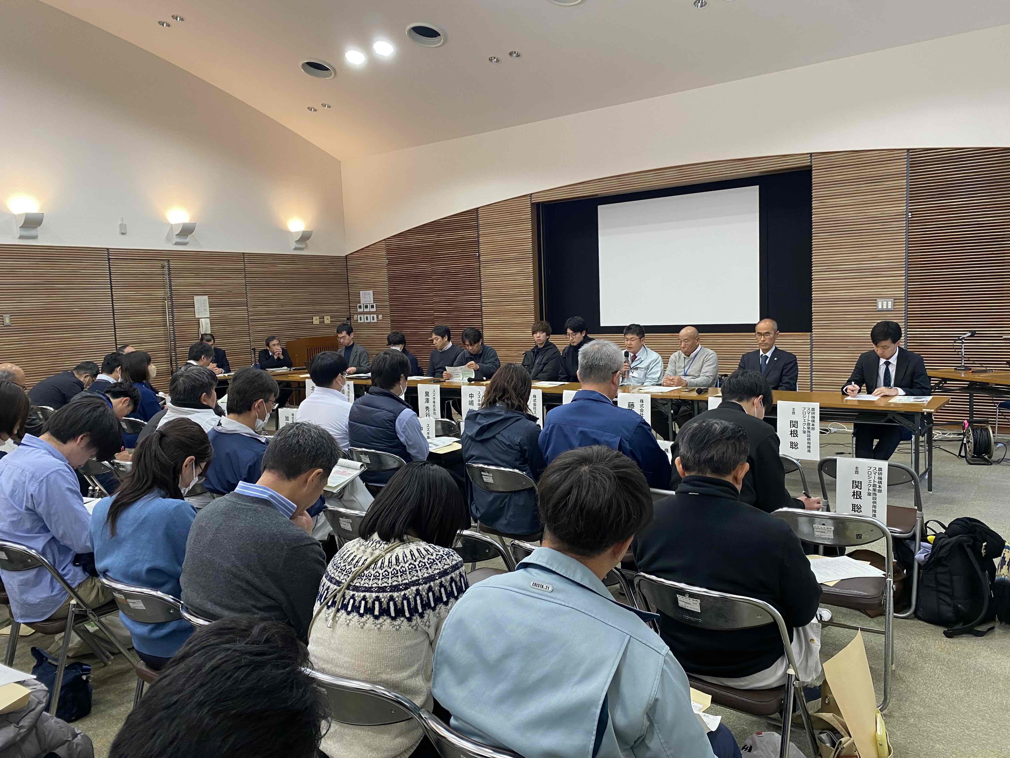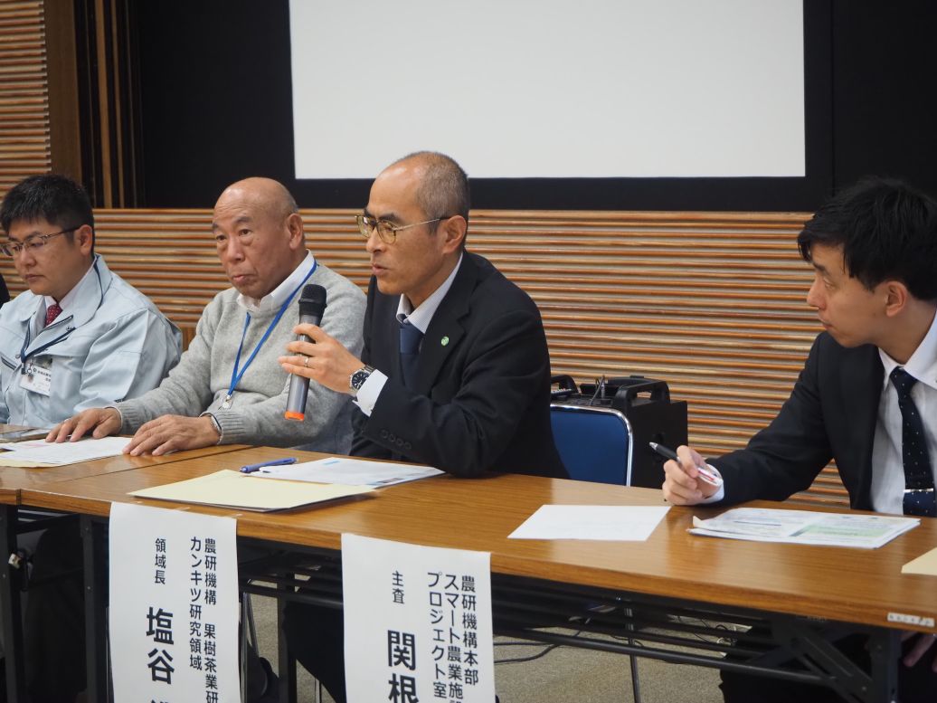研修会では、和歌山県果樹試験場主任研究員・水上徹氏から「ウンシュウミカン栽培におけるドローン防除・施肥技術について」、株式会社未来図代表取締役社長・藤戸輝洋氏から「自動航行ドローンを利用したスマート農業 農作業の省力化への取り組み」、農研機構 果樹茶業研究部門カンキツ研究領域長・塩谷浩氏から「中山間地域・傾斜地果樹園におけるスマート農業技術の開発状況」、農研機構本部スマート農業施設供用推進プロジェクト室・関根聡氏から「スマート農業イノベーション推進会議(IPCSA/イプサ)の活動紹介」と題してご講演いただきました。講演の後、全体質疑・意見交換の場が設けられ、活発な意見交換が行われました。研修会の様子
