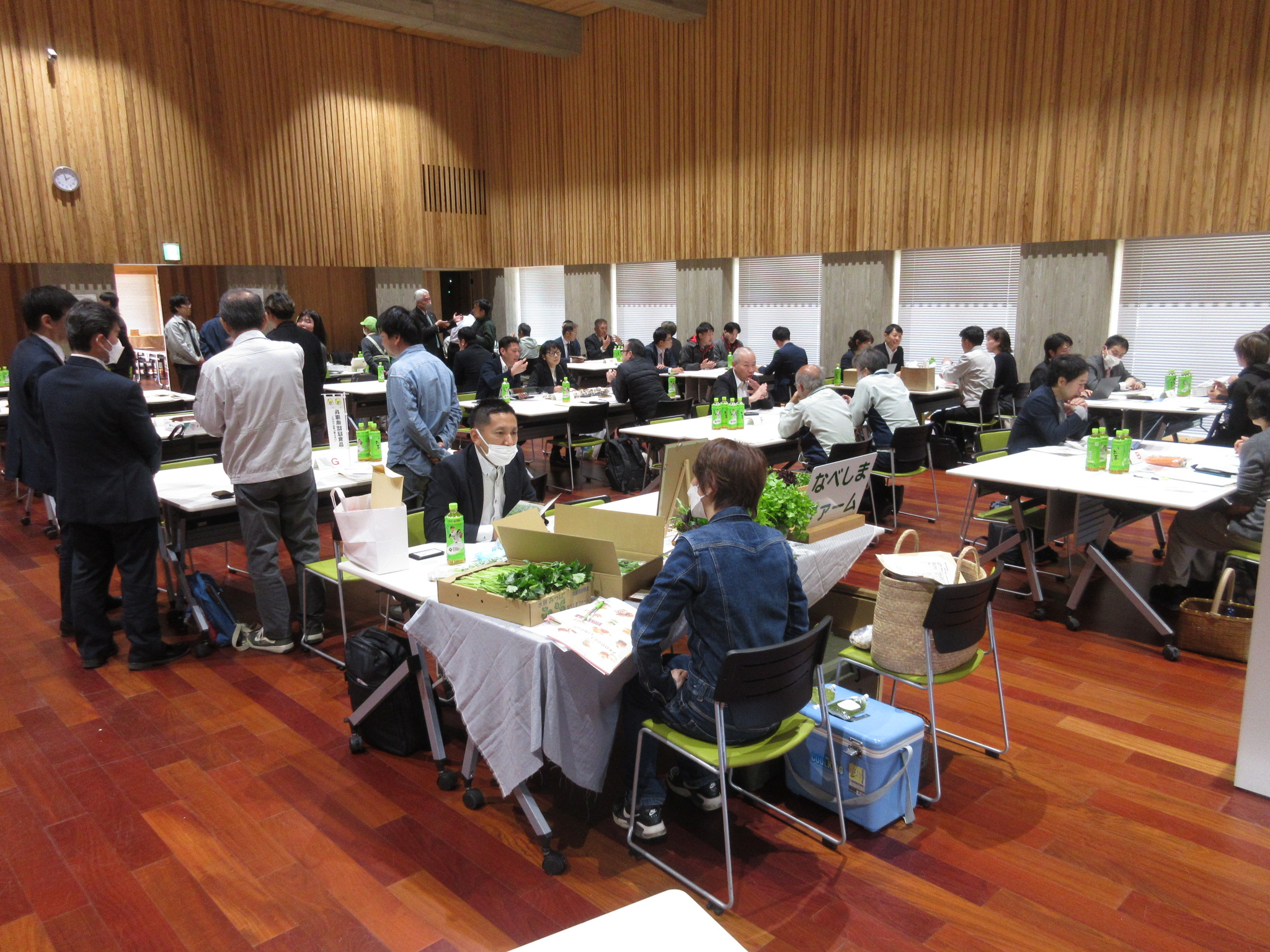 本商談会は、11時00分から太子町内のねぎ及びたつの市内のにんにくの栽培状況や特徴等を実需者に紹介しました。その後、13時30分から商談会を行い、生産者と実需者による延べ107回の商談が行われました。
