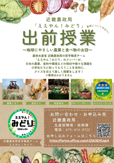 近畿農政局では、令和3年5月に策定された「みどりの食料システム戦略」の推進に向けて、若手職員を中心とした「ええやん!みどり」プロジェクトチームを設置し、同戦略に関する情報発信を実施しています。情報発信の一環として、日本の農業、食料や環境などの様々な課題や現状を子供たちに知ってもらうために、小学校の生徒を対象に、「ええやん!みどり」のメンバーが直接子供たちの前で授業を行うことで理解を深めてもらう「出前授業」を実施します。