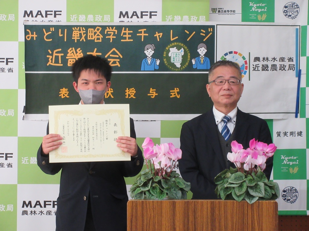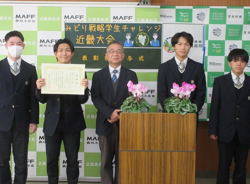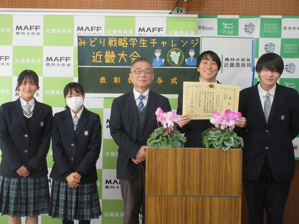 近畿農政局特別賞及び、優秀チャレンジ賞を受賞された京都府立農芸高等学校を訪問し、吉田地方参事官より表彰状の授与を行いました。