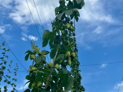 平成27年から地域をあげた栽培が始まった与謝野町ホップですが、農家の人材不足や高齢化、コロナ禍の影響等により、最盛期には2tを誇った生産量が現在は4分の1にまで減少しています。この危機的状況を受け、同社では与謝野ホップの自社栽培を始めました。与謝野町で栽培されているホップ11品種のうち、コロンバス、カスケード及びチヌークの3品種を栽培しています。
