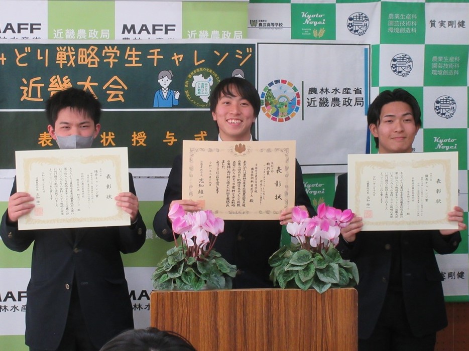 近畿農政局特別賞及び、優秀チャレンジ賞を受賞された京都府立農芸高等学校を訪問し、吉田地方参事官より表彰状の授与を行いました。