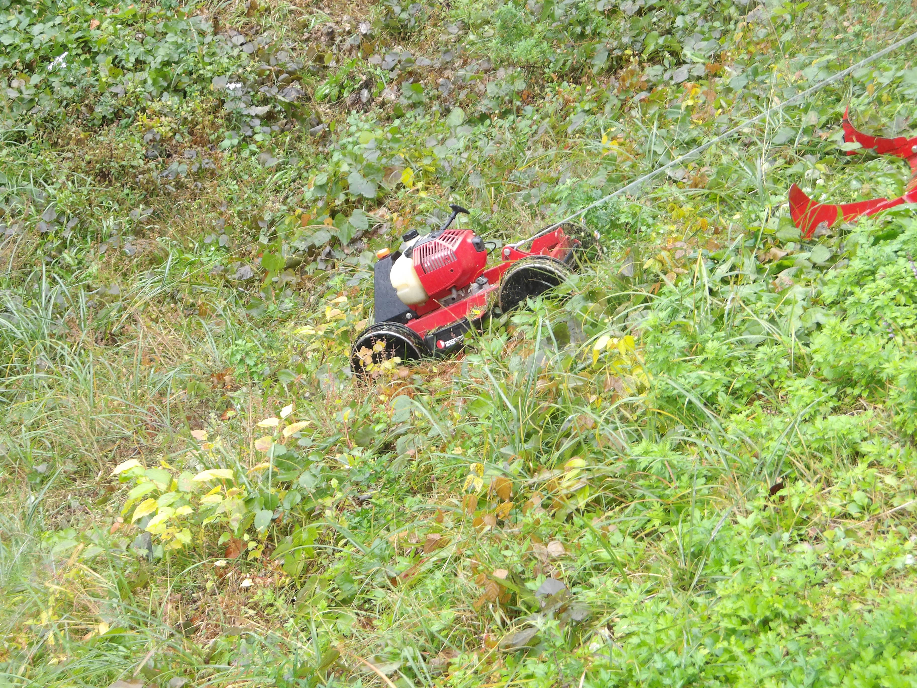 急斜面での草刈作業はかなりの労力がかかる上、大きな危険が伴います。研修会に参加された方は、急斜面での草刈機の予想以上の作業スピードに驚かれていました。またスピードだけでなく、子機がひっくり返った場合は「刈刃停止ボタンが自動で押される」等の安全面にも配慮された設計となっており、操作も簡単で身体的負担も少なく、今後の草刈作業の見直しをするための参考になったとの感想がありました。