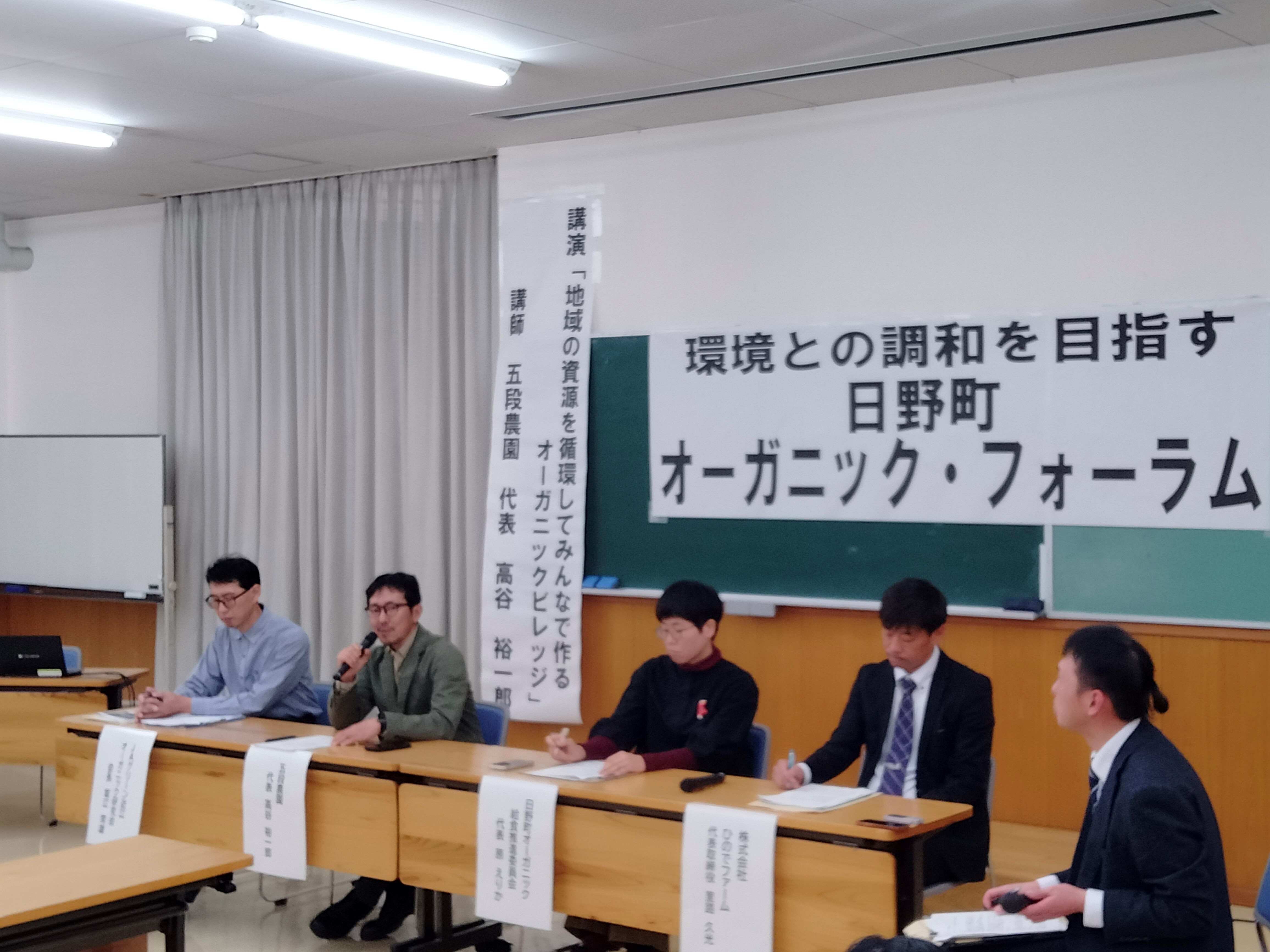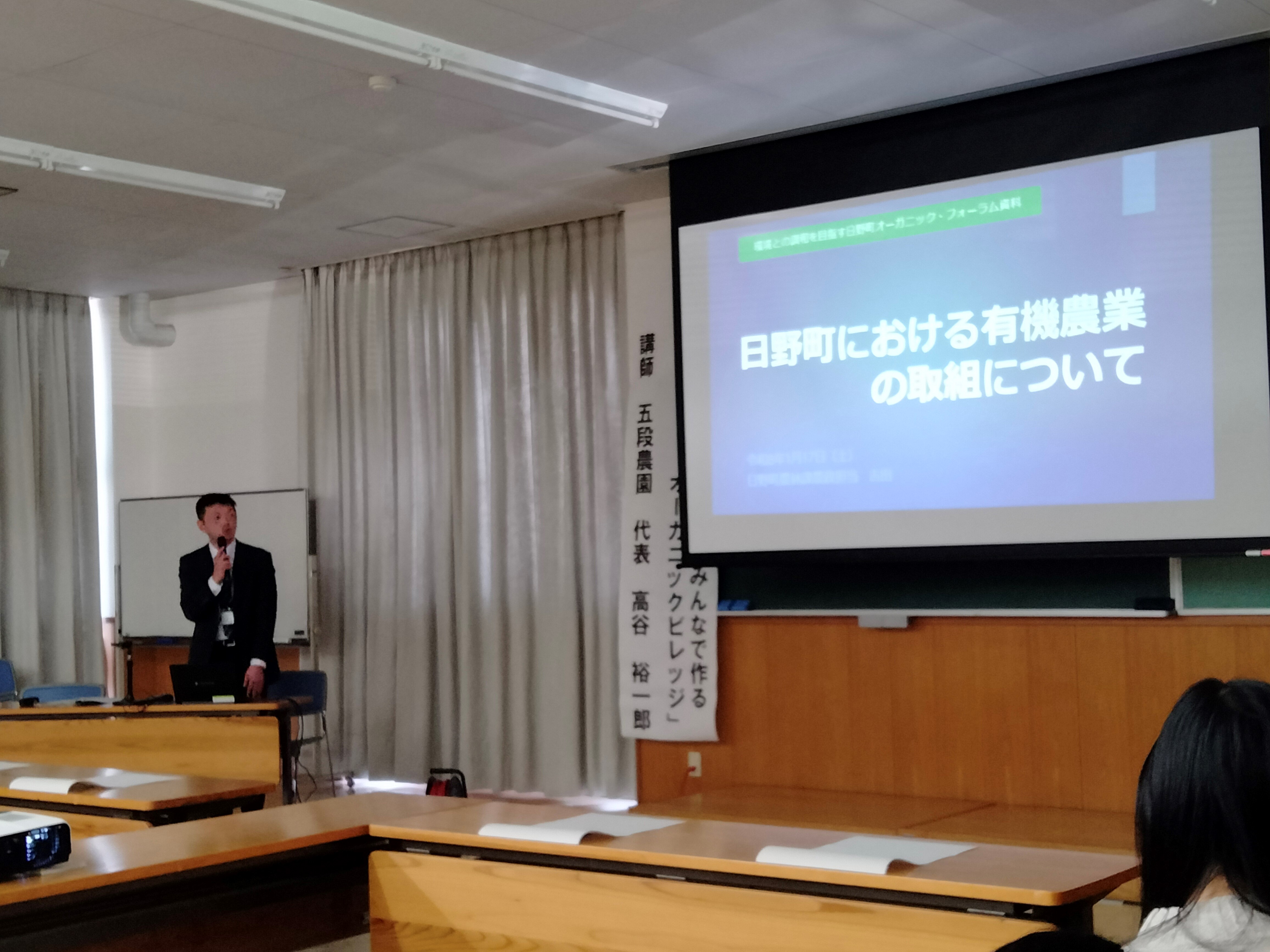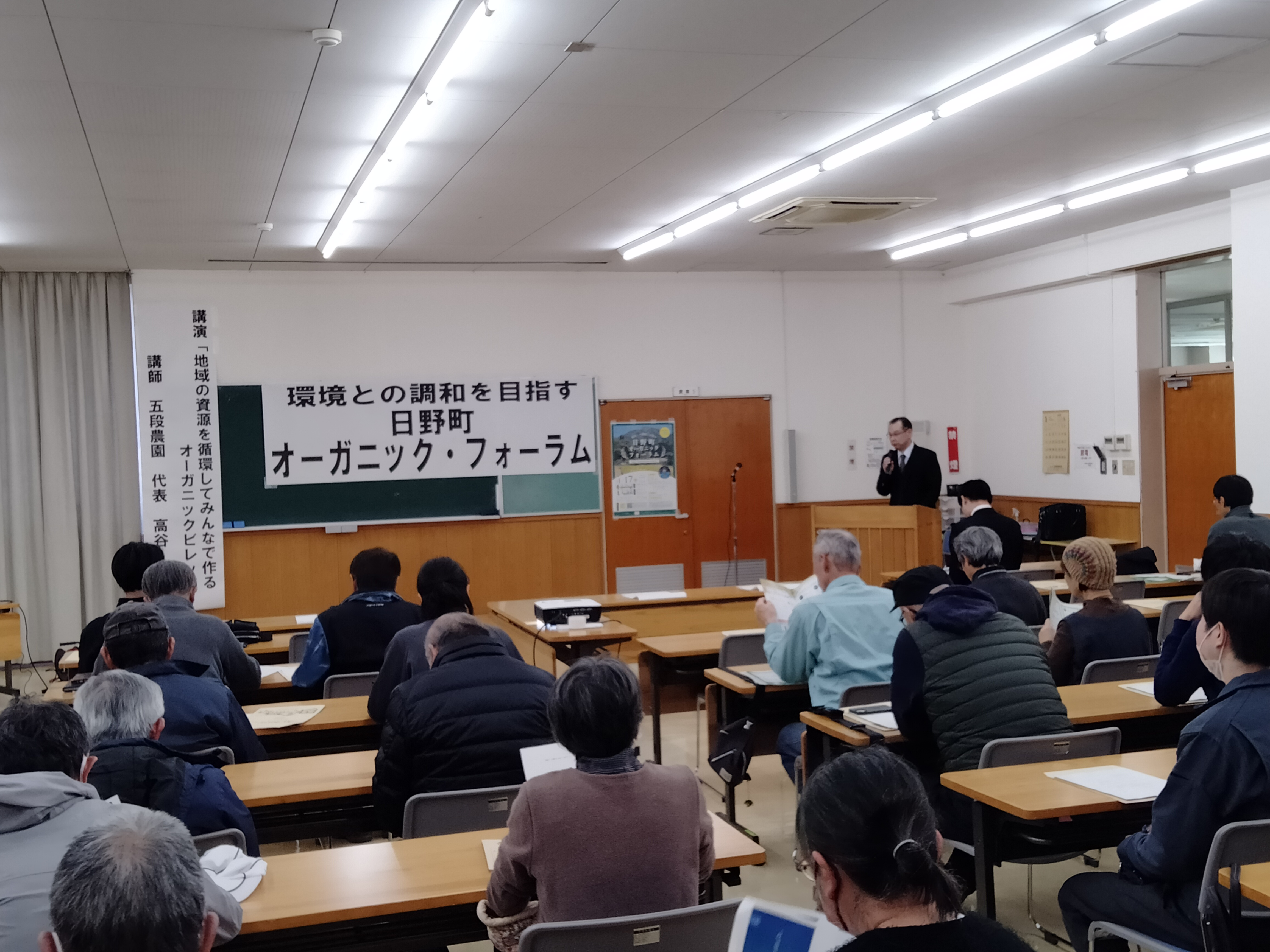 堀江町長の開会挨拶のあと、五段農園(岐阜県白川町)代表 高谷 裕一郎 氏から「地域の資源を循環してみんなでつくるオーガニックビレッジ」についての講演と、日野町農林課から「日野町の有機農業の取組について」の話題提供がありました。