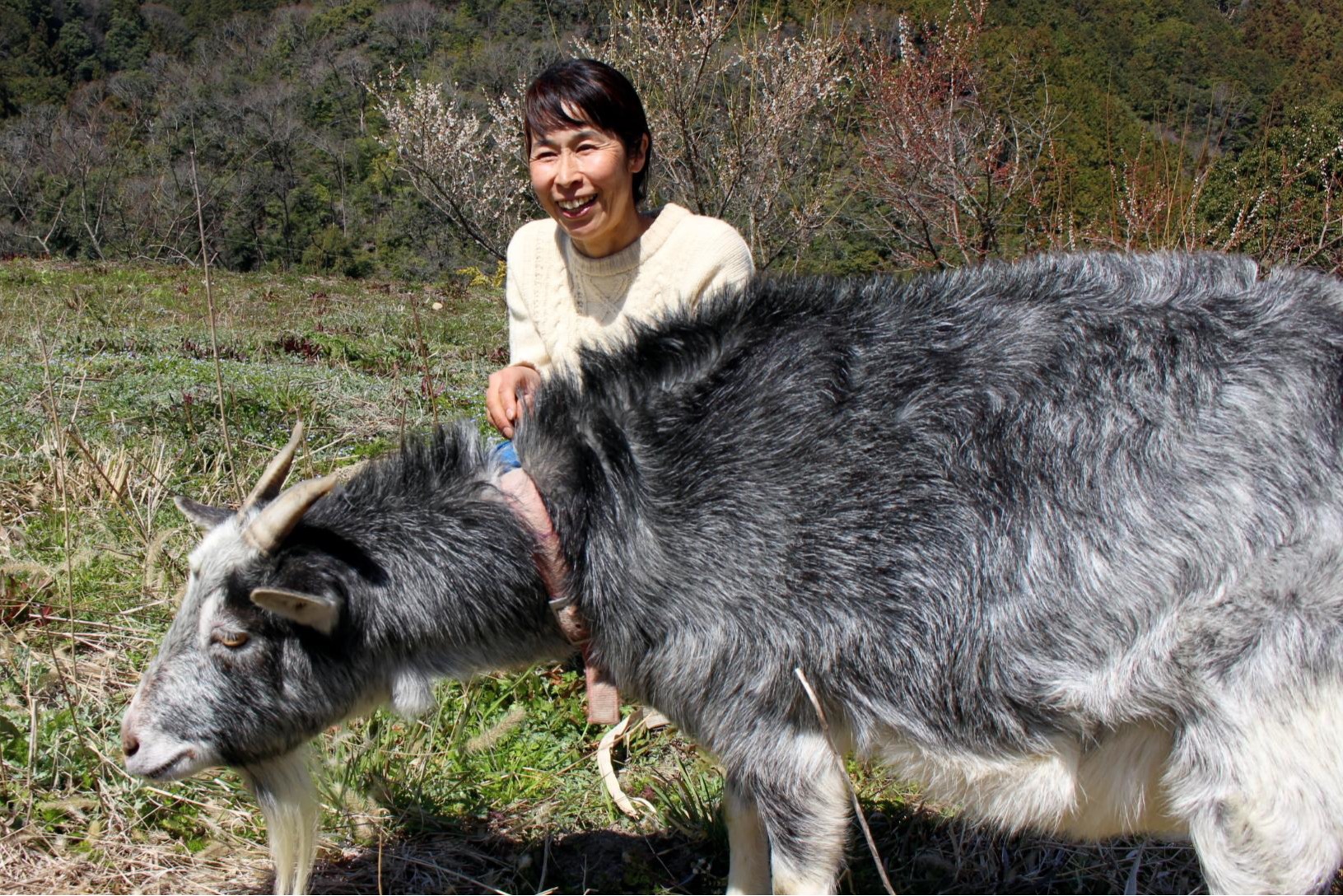 篠﨑さんとヤギの「クーちゃん」。畑の雑草を食べてくれる大切な家族。