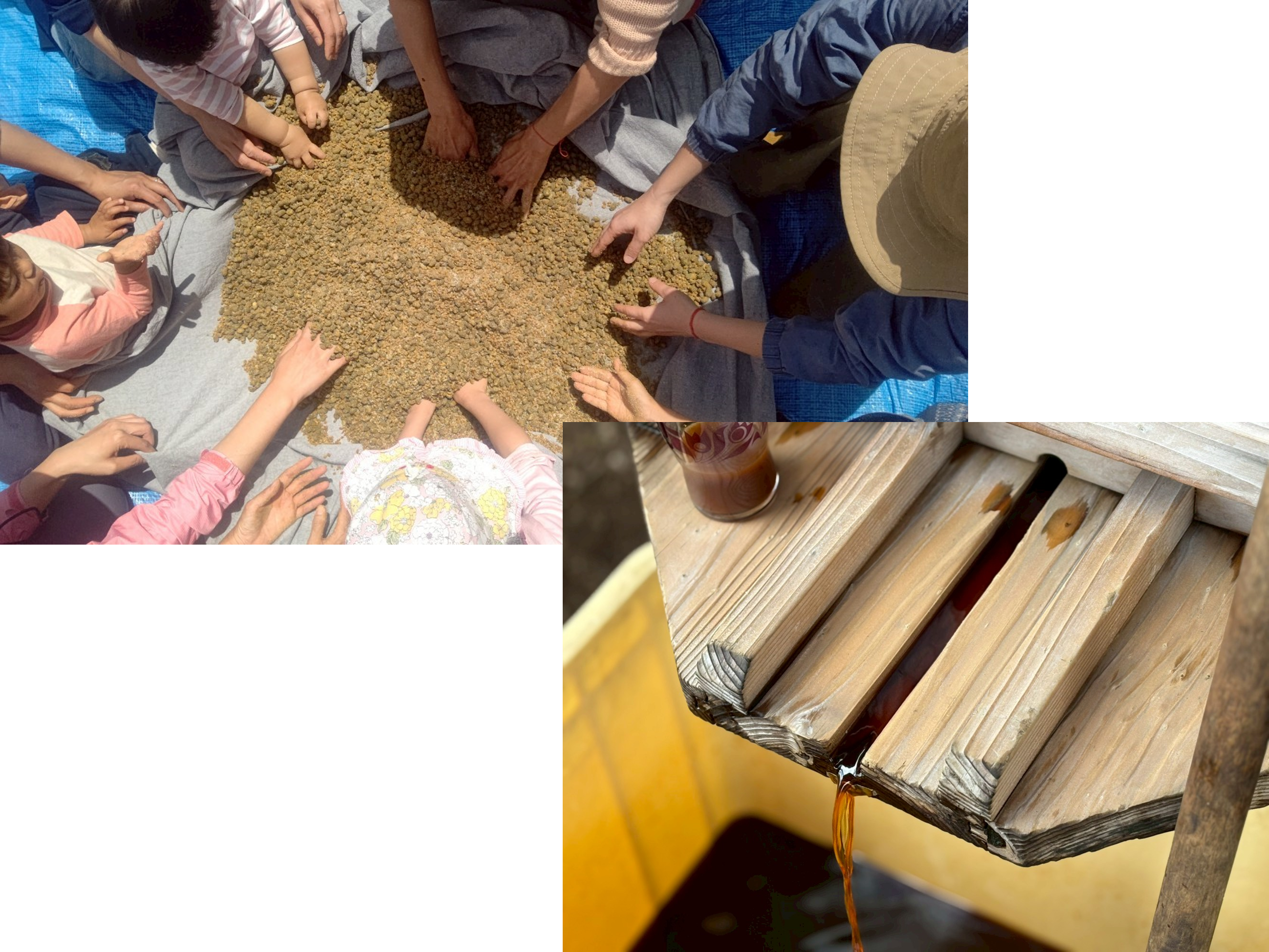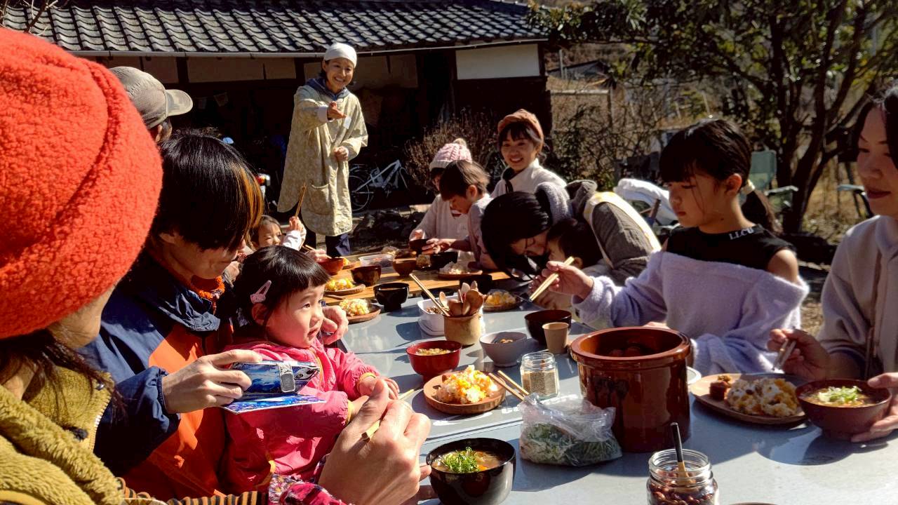 月2回開催しており、子どもから大人まで誰でも参加できます。畑で種をまき、育った作物が食卓にのぼるまでのひとつながりを自然の中で体験できます。ヨモギ餅づくり、草木染め、醤油・味噌づくりや、たくあん漬けなど、昔ながらの製法を楽しみ、味わうことができます。冬は焚火で焼いた焼き芋が子どもたちに大人気だとか。