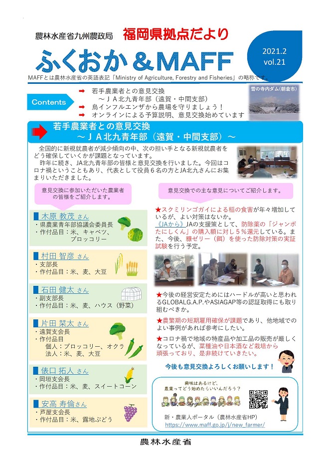 福岡県拠点だよりVOL.21(PDF : 657KB) | →若手農業者との意見交換 ~JA北九青年部(遠賀・中間支部)~ →鳥インフルエンザから農場を守りましょう! →オンラインによる予算説明、意見交換始めています |