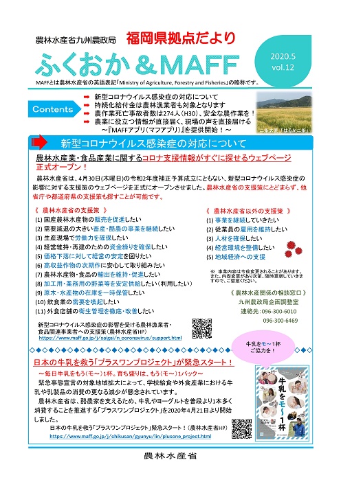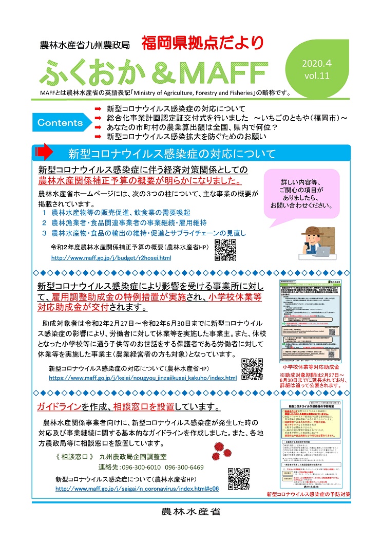 福岡県拠点だよりVOL.12(PDF : 265KB) | →新型コロナウイルス感染症の対応について →持続化給付金は農林漁業者も対象となります →農作業死亡事故者数は274人(H30)、安全な農作業を! →農業に役立つ情報が直接届く、現場の声を直接届ける~『MAFFアプリ(マフアプリ)』を提供開始~ |