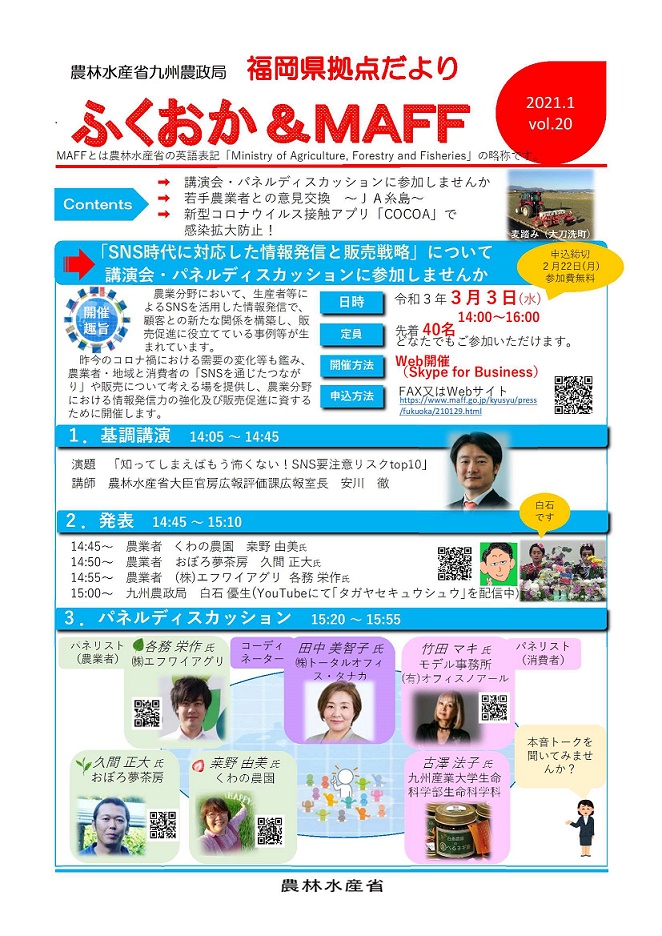 福岡県拠点だよりVOL.20(PDF : 654KB) | →講演会・パネルディスカッションに参加しませんか →若手農業者との意見交換 ~JA糸島~ →新型コロナウイルス接触アプリ「COCOA」で感染拡大防止! |