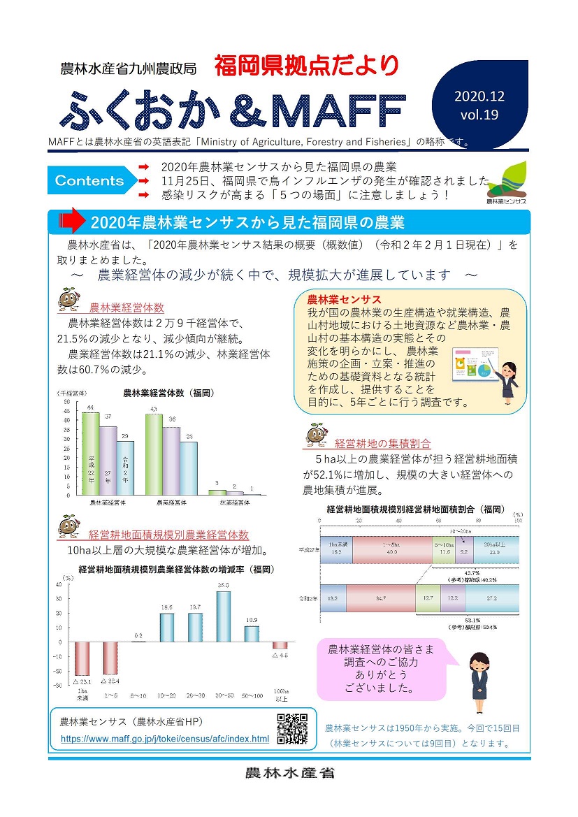 福岡県拠点だよりVOL.19(PDF : 691KB) | →2020年農林業センサスから見た福岡県の農業 →11月25日、福岡県で鳥インフルエンザの発生が確認されました →感染リスクが高まる「5つの場面」に注意しましょう! |
